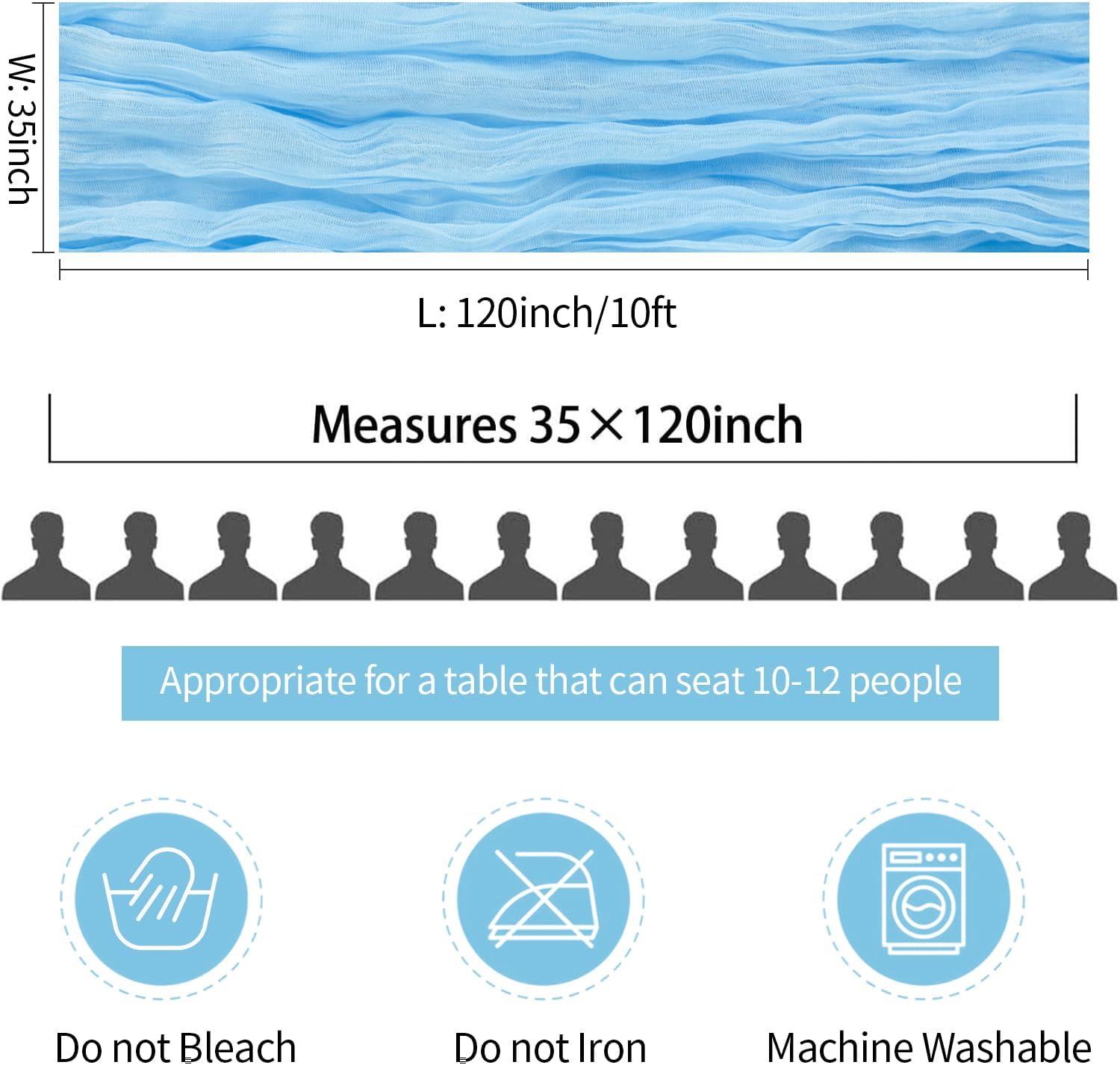 - 🎊【Cute Baby Blue Cheese Cloth Table Runner】Set of 3 baby blue cheesecloth gauze table runners. Each boho table runner is 35" W x 120" L, a perfect length for a 6ft/ 8ft round or rectangle table that can accommodate 8-10 people.It can also be spliced together for long tables. A simple and easy way to dress up a table as wrinkled design no ironing is required & they add a soft touch to your decor! The light blue gauze table runners can be compressed, lightweight, and compact, easy to store, more space-saving.
