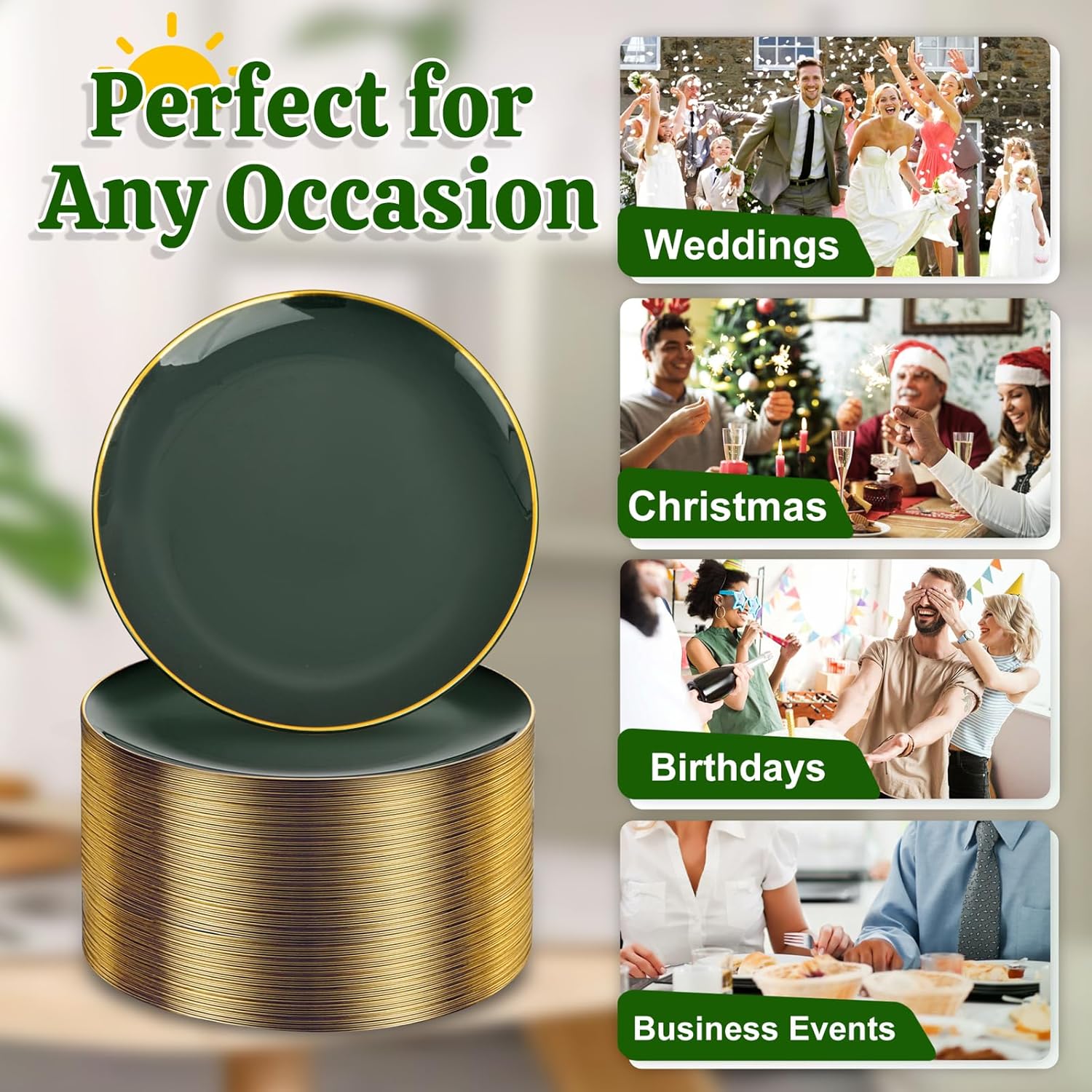 - 100 GUESTS: Green Gold dessert plates set for you to prepare 100pcs 6.3 β gold plastic dessert plates and 100pcs 5 " gold plastic forks, a complete set to meet the needs of 100 guests to enjoy appetizers, cakes, desserts and other delicacies, Green plastic plates and forks are ideal for large banquets and parties.
