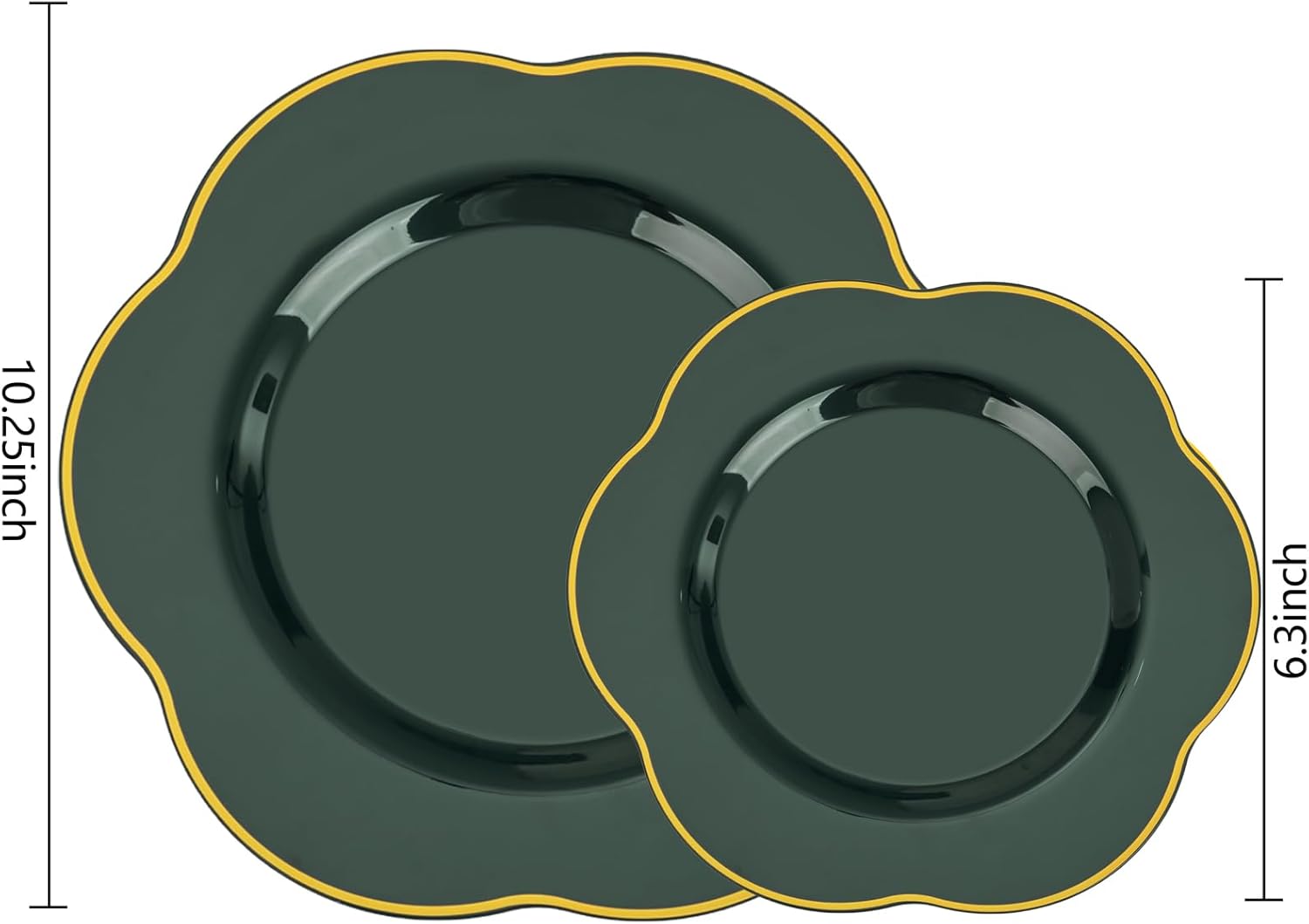 - UNIQUE DESIGN AESTHETICS: Our green and gold plates have a unique six-petal shape, which is elegant and adds a unique flavor to the table; the hot stamped gold rim design of this green disposable plates enhances the overall texture and shows off luxury and sophistication, which easily creates a high-end dining atmosphere