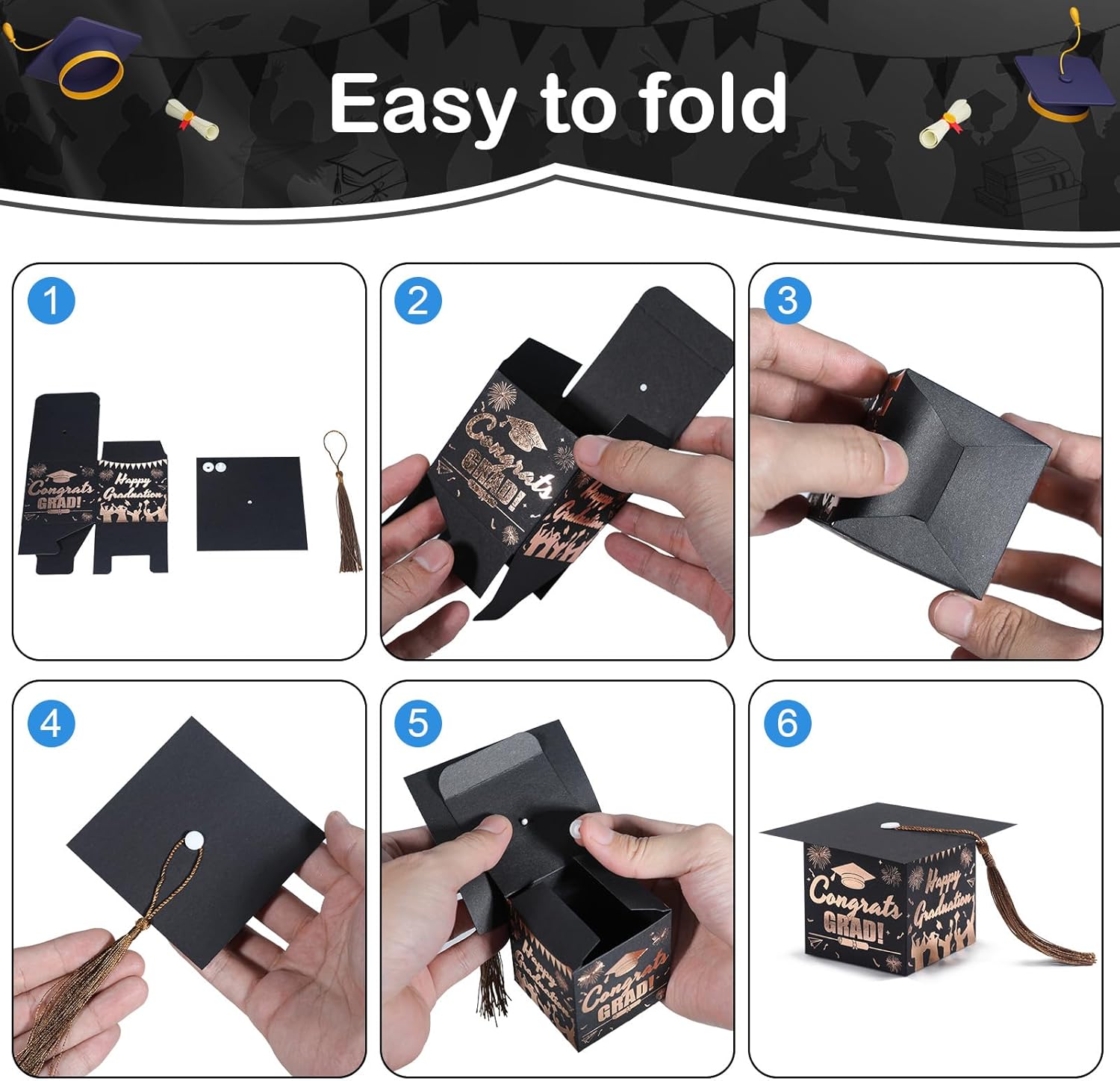 - Easy to Assemble: The graduation treat boxes are flat packed and easy to fold, saving you time and effort during your event preparation. Simply assemble them according to the crease with a few easy steps, fill it with small delectable treats or other small gifts you would like to present, making the gift-giving moment meaningful and memorable