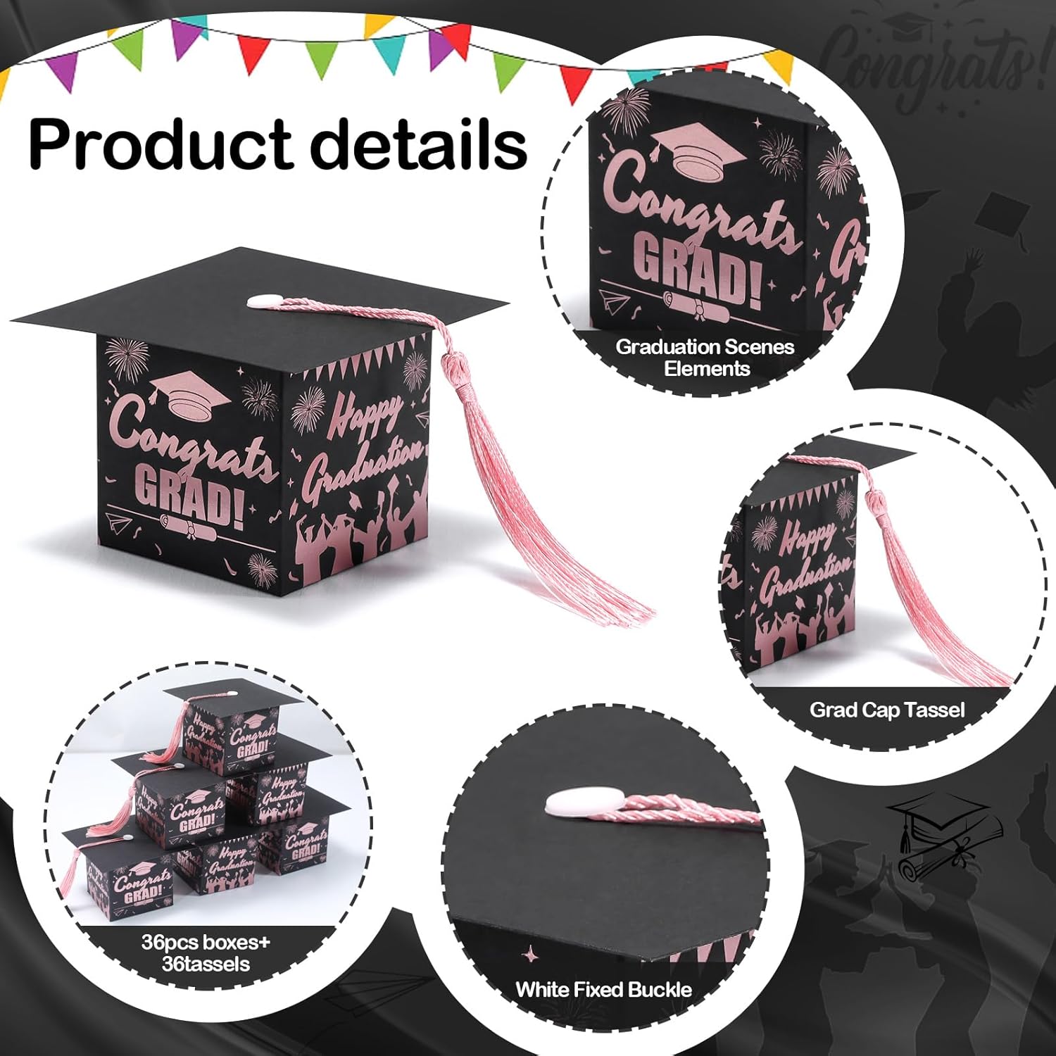 - Package Included: 36 x Mini Gift Boxes; 36 x Tassels; 36 x Pairs of Fixed Buckles; 1 x Instruction Paper. With a total quantity of 36 pieces, you have enough amount of graduation gift boxes to meet varieties of needs for graduation party gifts and part favors, graduation table decorations, graduation cap decorations, graduation centerpieces, adding a delightful touch to your graduation festivities