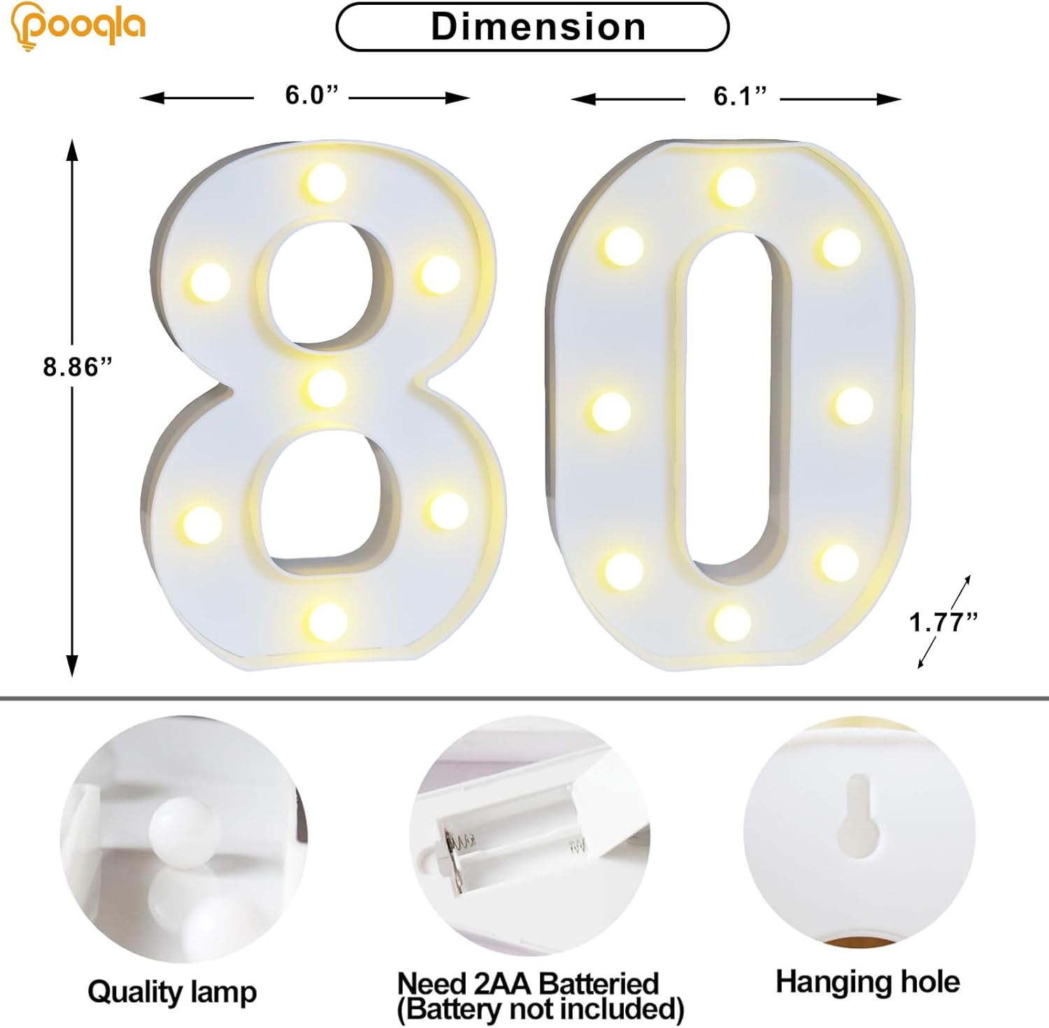 Pooqla 80th Birthday Decoration for Woman Man, Decorative LED Light Up Numbers, Marquee Numbers 80 Sign for Party Backdrop 80th Wedding Anniversary Decor, Warm White and Cool White Number 80