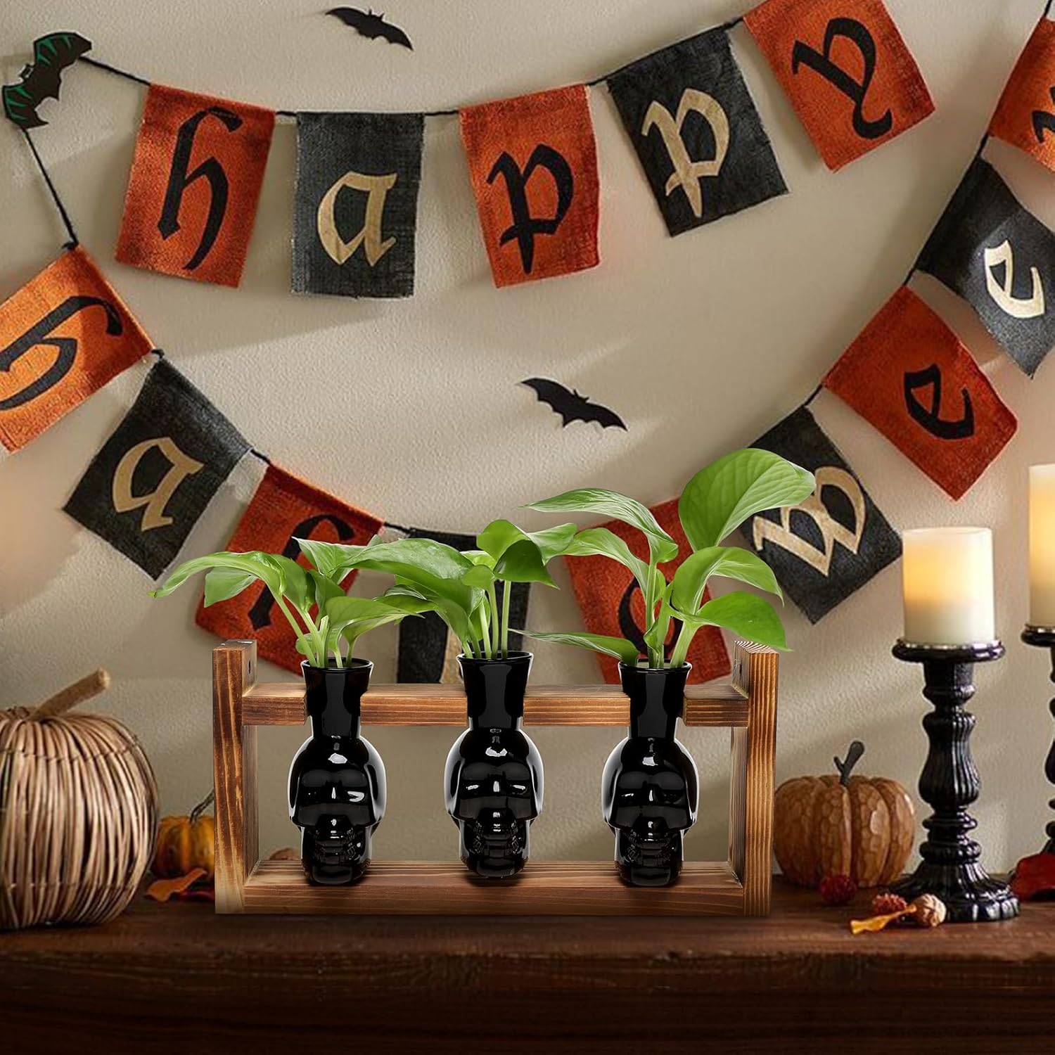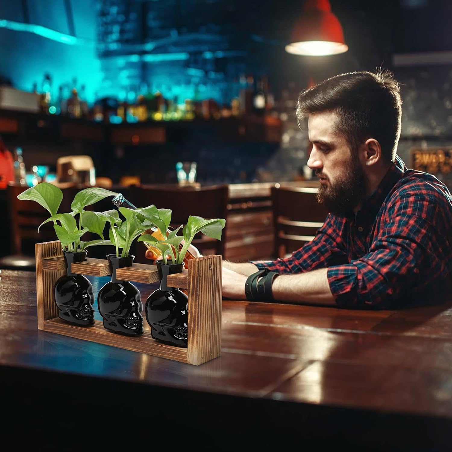 Plant Terrarium Propagation Stations Hydroponics Halloween Skull Planter Vase Skulls Decor with Wooden Stand Gife for Father