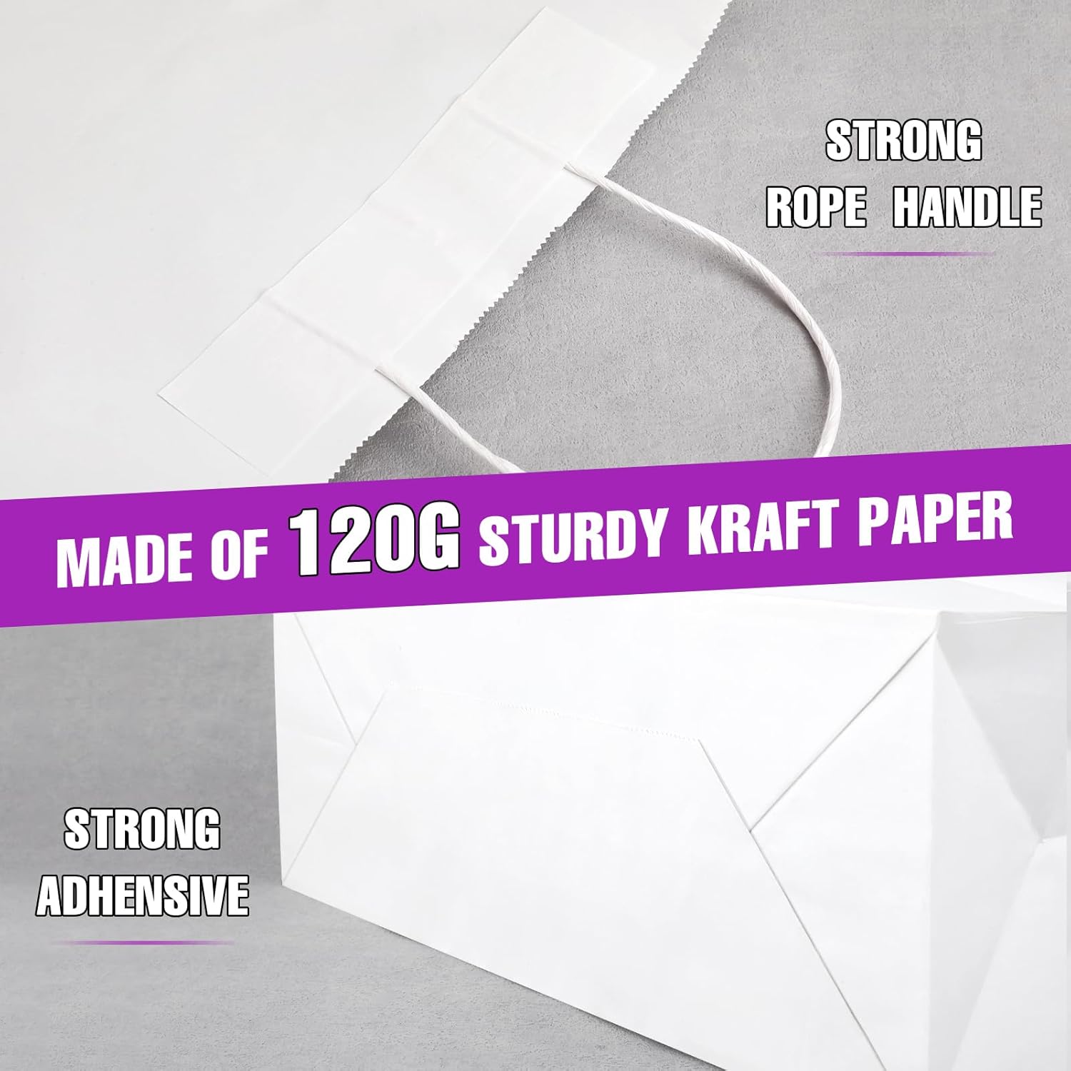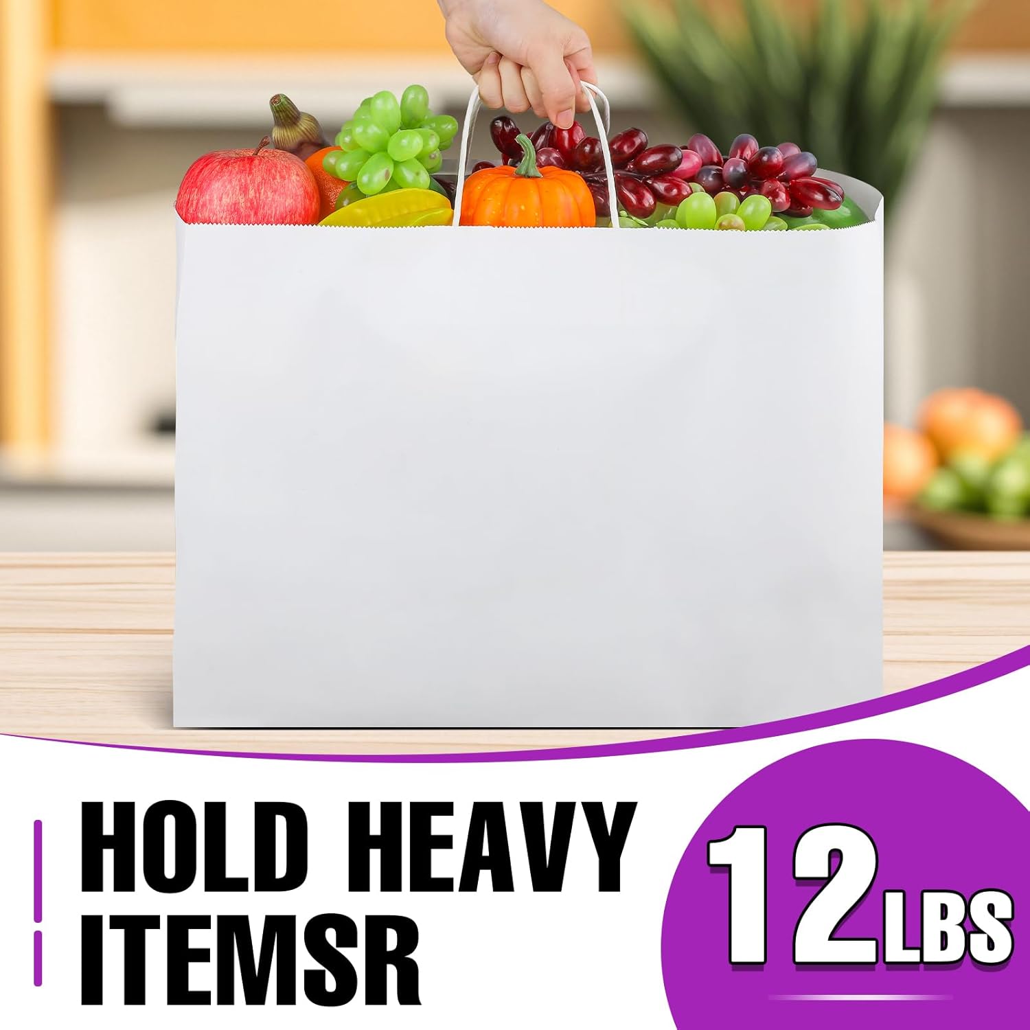 - ECO-FRIENDLY LARGE WHITE PAPER BAGS - 100 pack 16x6x12 inches sturdy and durable white bags are made of premium quality kraft paper and have well structured paper twisted handles.