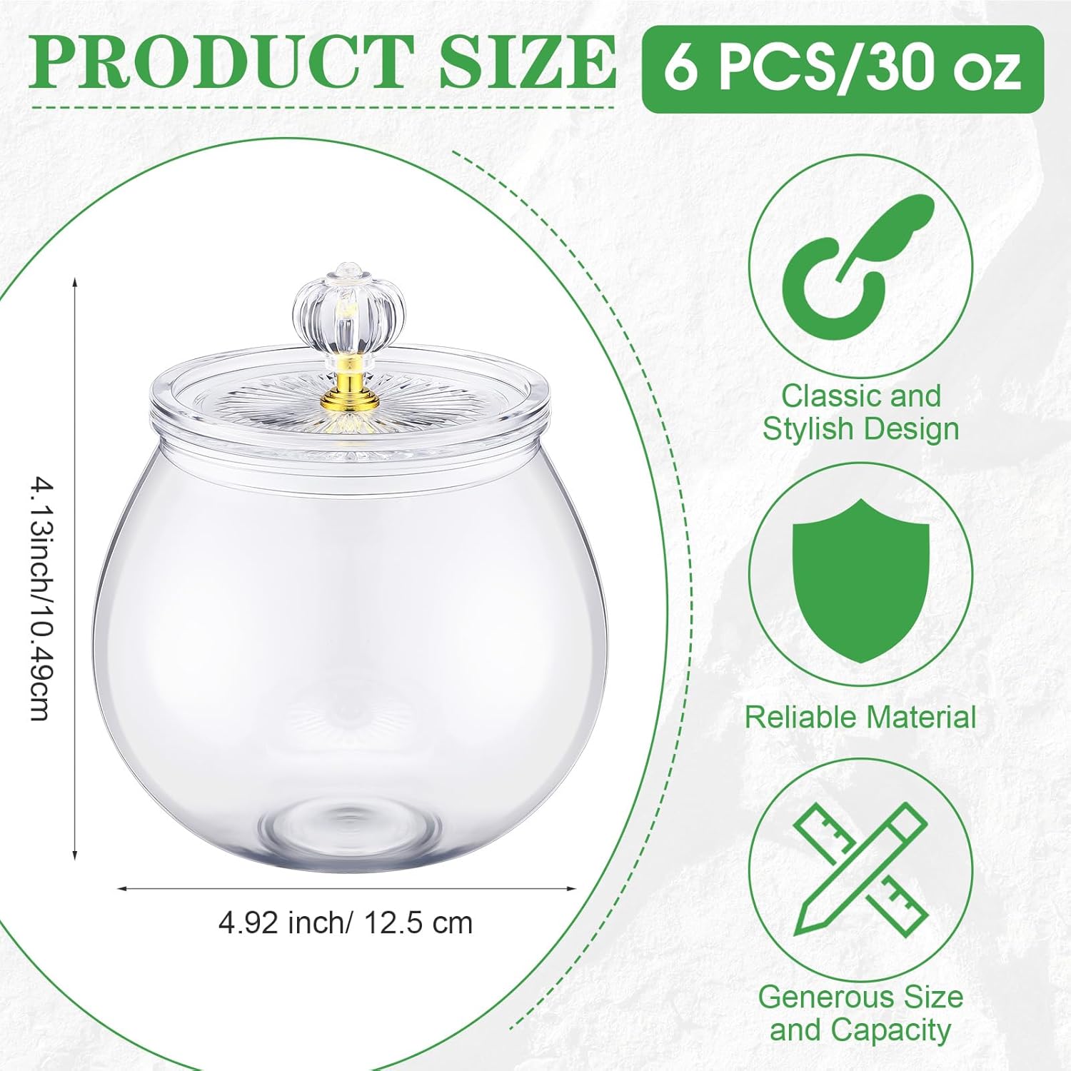 - Size and Capacity: the brilliant design of these plastic candy jars with lids boasts a size of about 4.92 x 4.13 inches/ 12.5 x 10.5 cm (excluding lid height); This space saving feature enables you to store up to 30 oz of your favorite sweets or snacks, fitting well on your kitchen counter or dining table