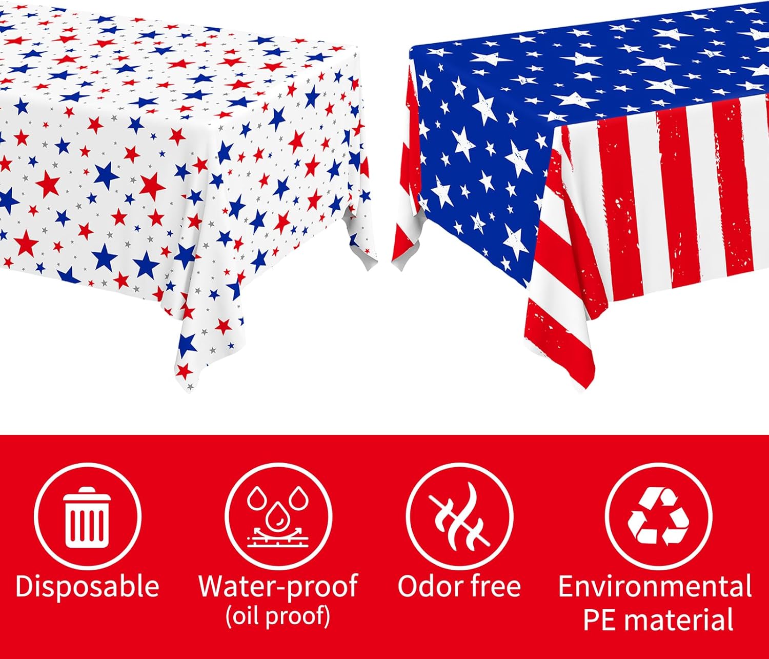 - Celebrate Independence with Style: Elevate your Fourth of July celebration with our patriotic tableware bundle. Featuring 2 Pack, 54"X108" which is enough to cover a rectangular table up to 8 feet. (in a mix of 2 diverse designs), it ensures your decor vibrates with freedom and patriotism vibes, making your Independence Day celebration truly unforgettable.