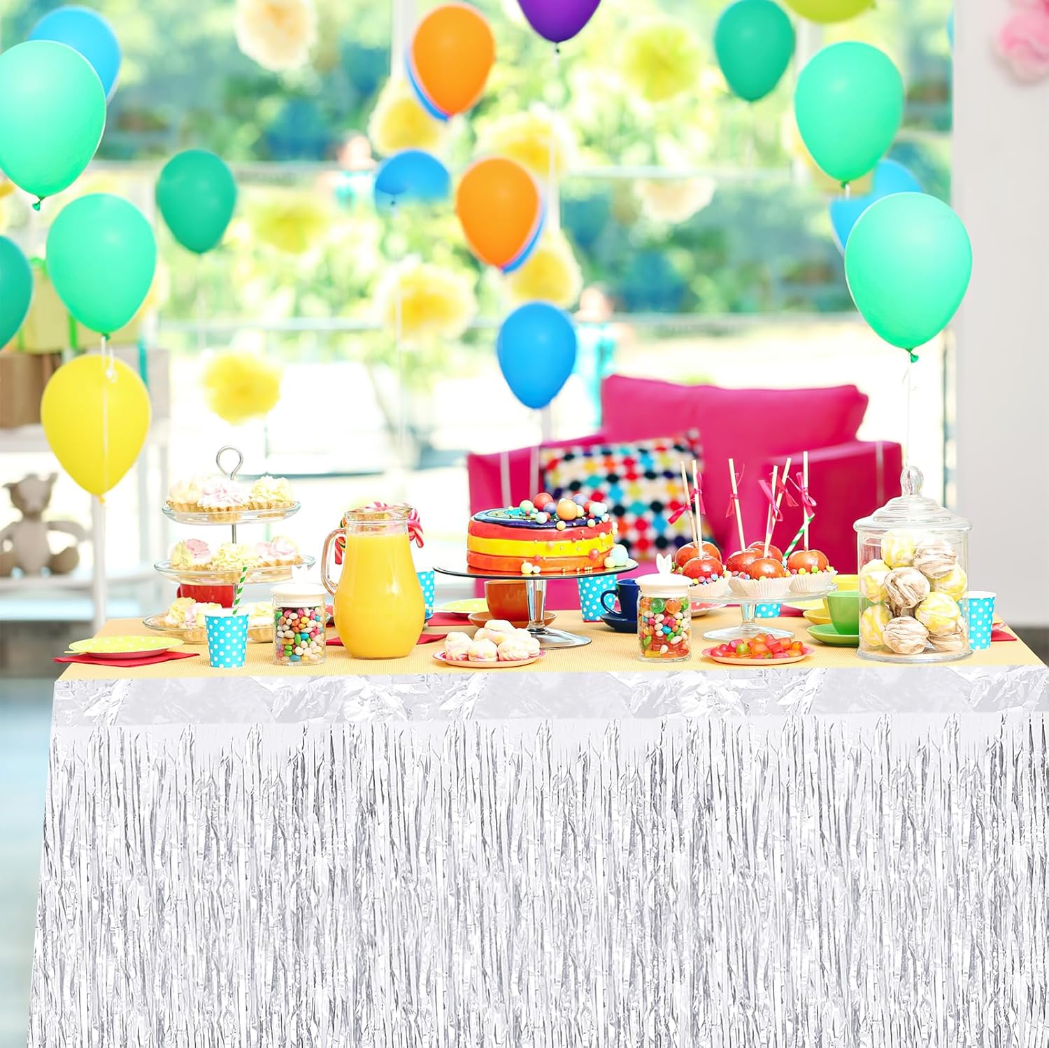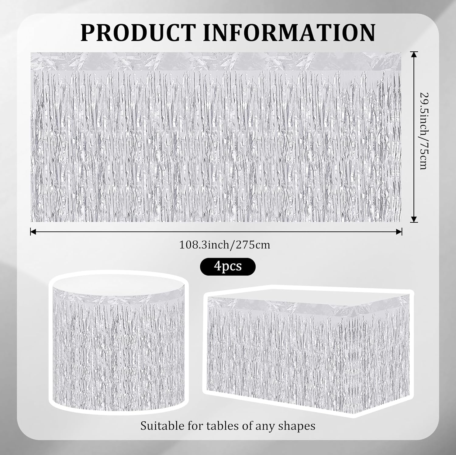 - 【Package Included】You will receive 4 packs of fringe table skirt, the size of the party table skirt is 75 x 275cm/ 29.5 x 108 inches. Color: Silver. which is enough to decorate your party, provide you with excellent decoration effect and light up the party atmosphere. Perfect for creating a stunning backdrop for any occasion.