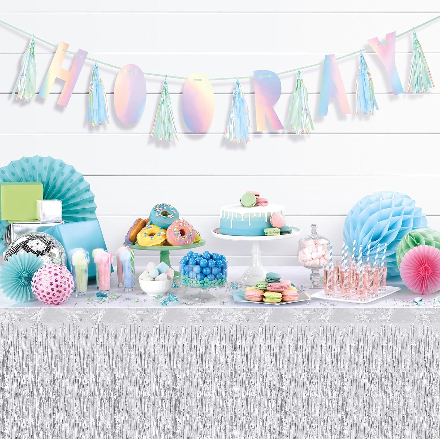 - 【Easy to Use】Our metallic foil fringe table skirt was easy to assemble, it has an adhesive strip on the back and go directly on the edge of the round table or rectangle table. It can be easily cut into any size. With its strong self-adhesive, will stay securely in place throughout your celebration. They can definitely take your party up a notch and build up a wonderful party scene.