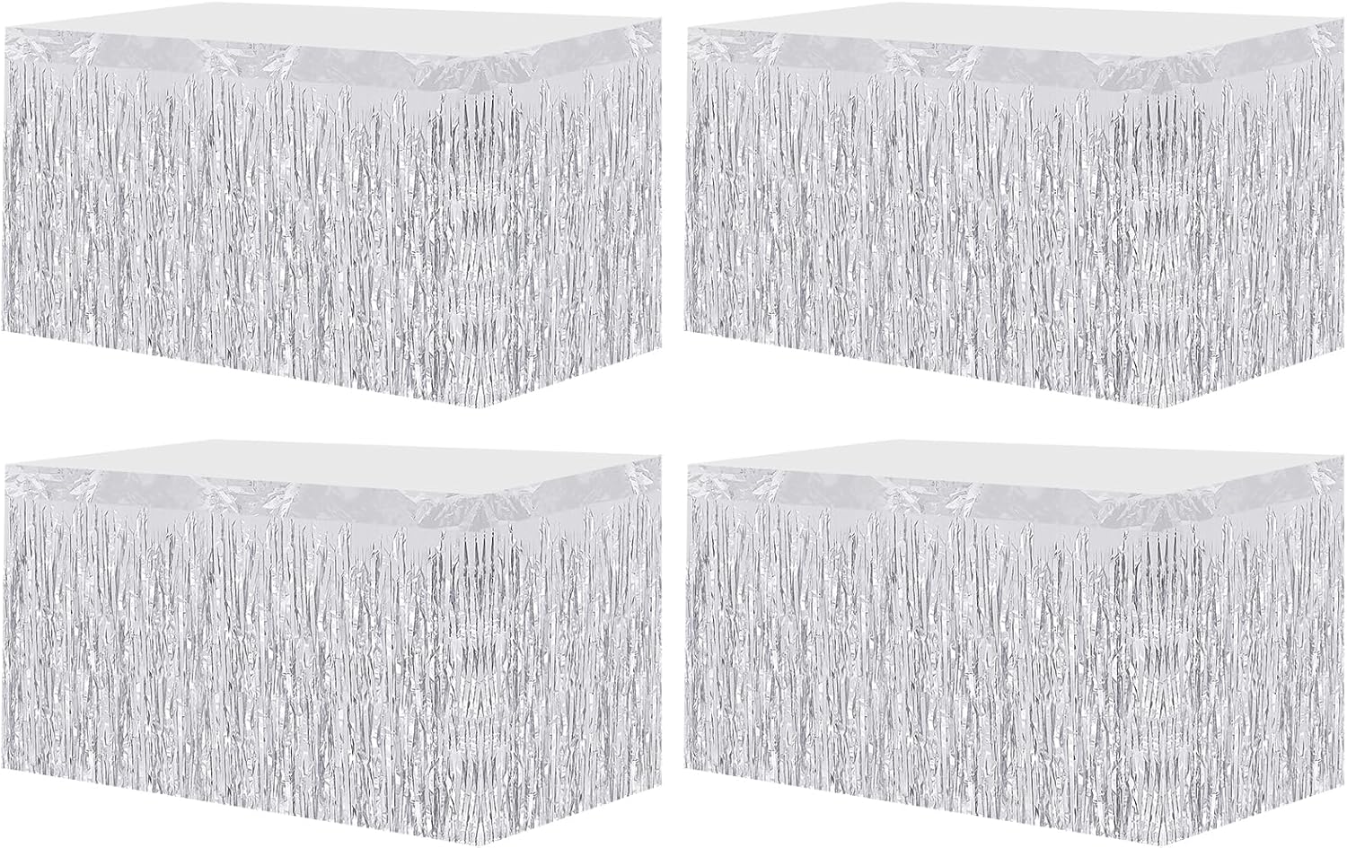 4 Pack 29.5x108 Inch Metallic Foil Fringe Tinsel Table Skirts, Streamer Garland Curtains Backdrop for Rectangle Tables Wedding Birthday Parade Floats Christmas Party Decoration(Silver)