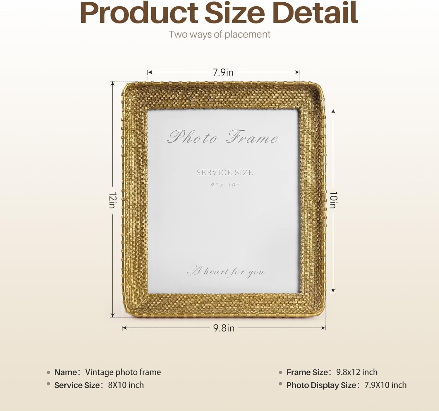 - Gold picture frames accommodate a 8x10 inch picture size, while the picture display size is 7.9x10 inch.