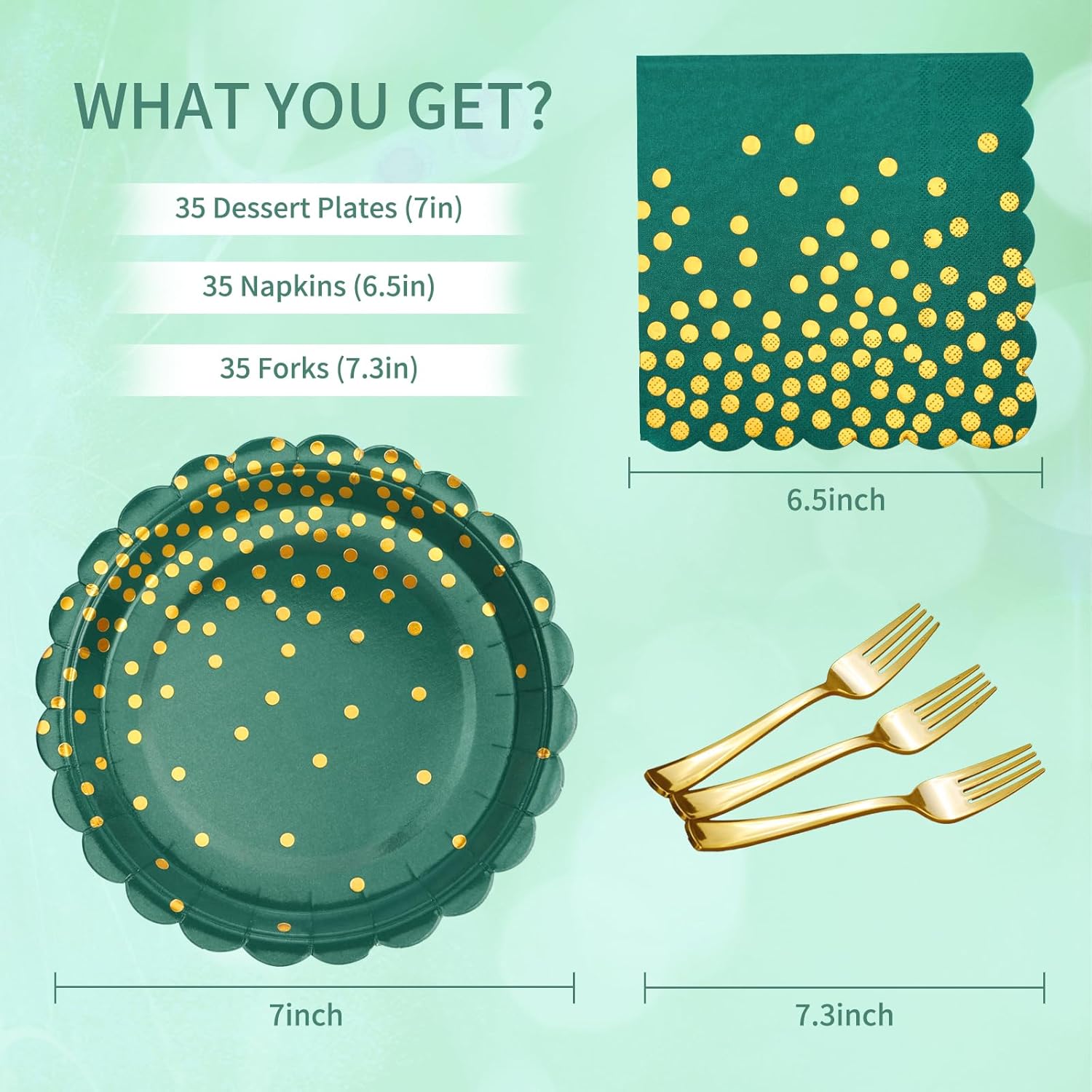 - 【Green Paper Plate Set】Green party supplies include: 35 7-inch green dessert plates, 35 soft green napkins, 35 gold forks. These green party plates meet your party needs and are perfect for your party. These green plates disposable will bring you and your guests unforgettable memories in one go