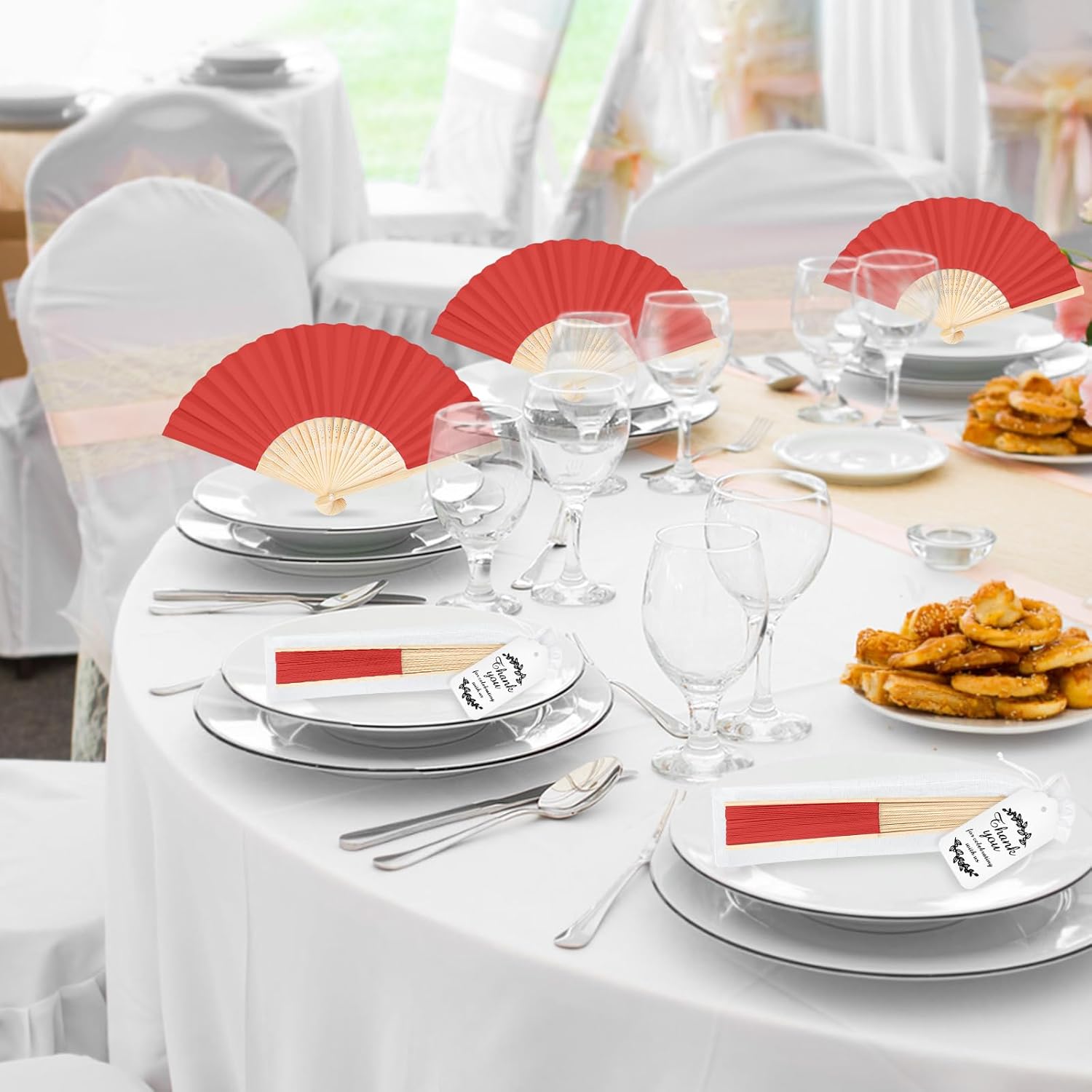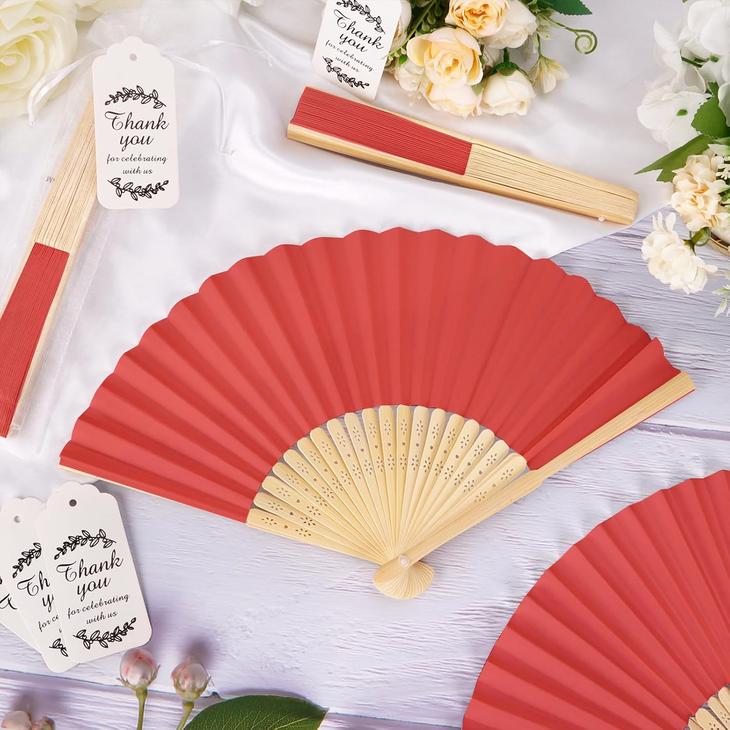 50Set Wedding Hand Fans Party Favors Red Paper Folding Handheld Fans Bulk, DIY Bamboo Fans with Thank Tag Organza Bag for Guests Bridal Dancing Props Church Decoation