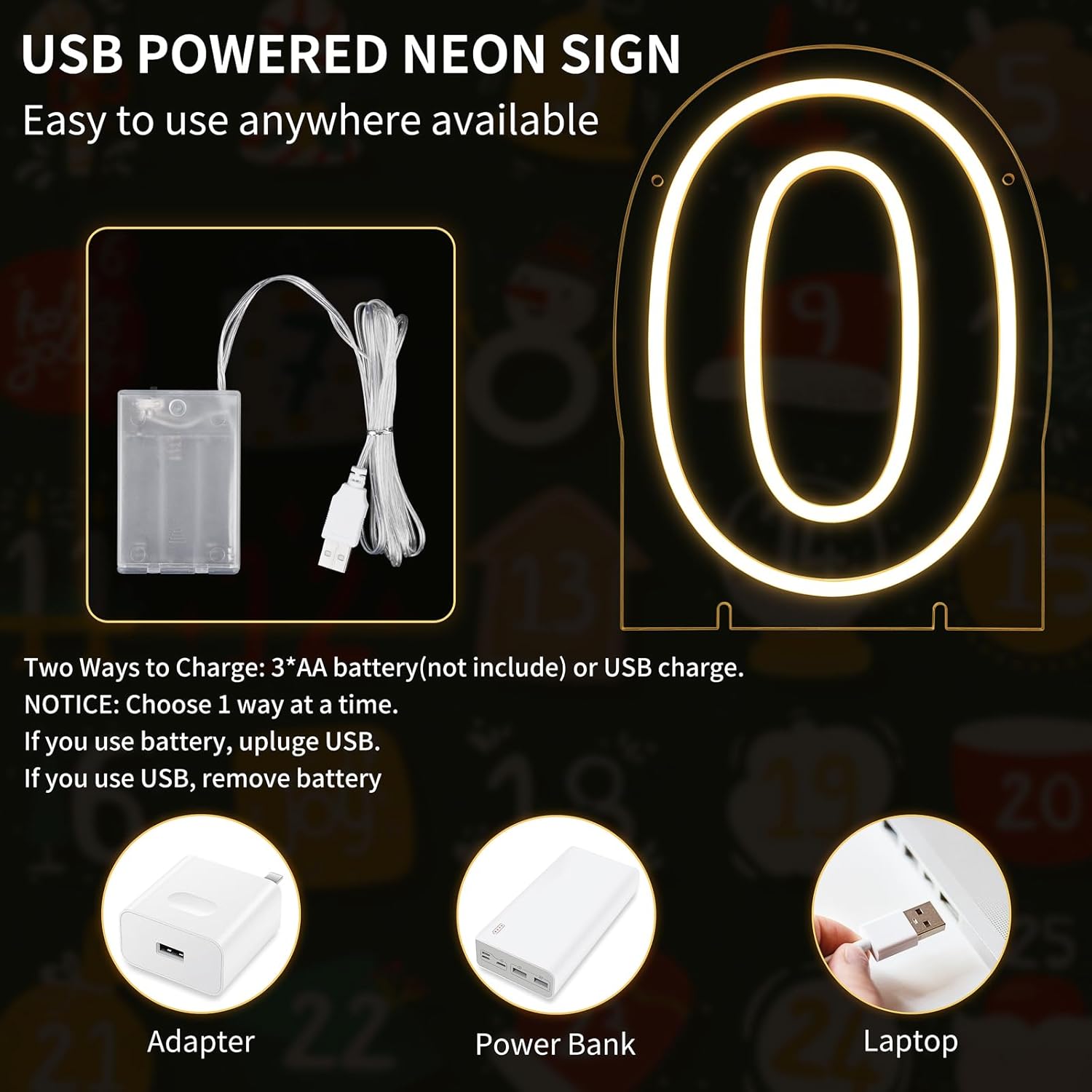 - Plug, Play, and Party! Super easy to use: just plug in the USB, hit the power button, and watch it glow! No outlet? No problem! Use the battery compartment (3 AA batteries not included) for cord-free fun. Perfect for indoor flair or outdoor sparkle (rain-free, please!).