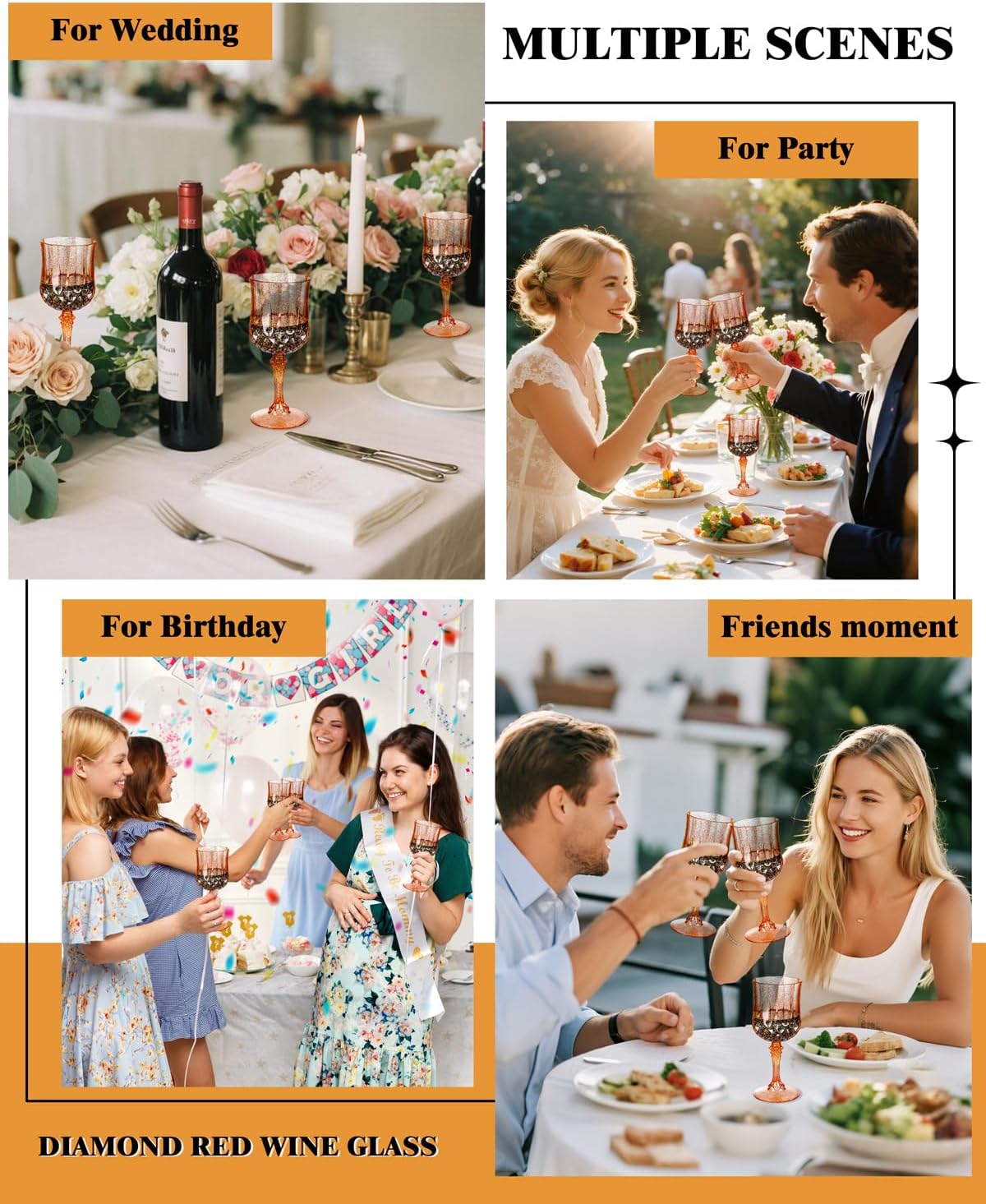 - Multi-occasion use: These 7 Oz disposable wine glasses can be used in various occasions, such as entertainment events, weddings, bars, or casual gatherings. These plastic Amber with glitter wine cups blend seamlessly with tableware. Plastic goblet glasses can not only serve as table decorations but also hold wine, beer, cocktails, juice, and so on