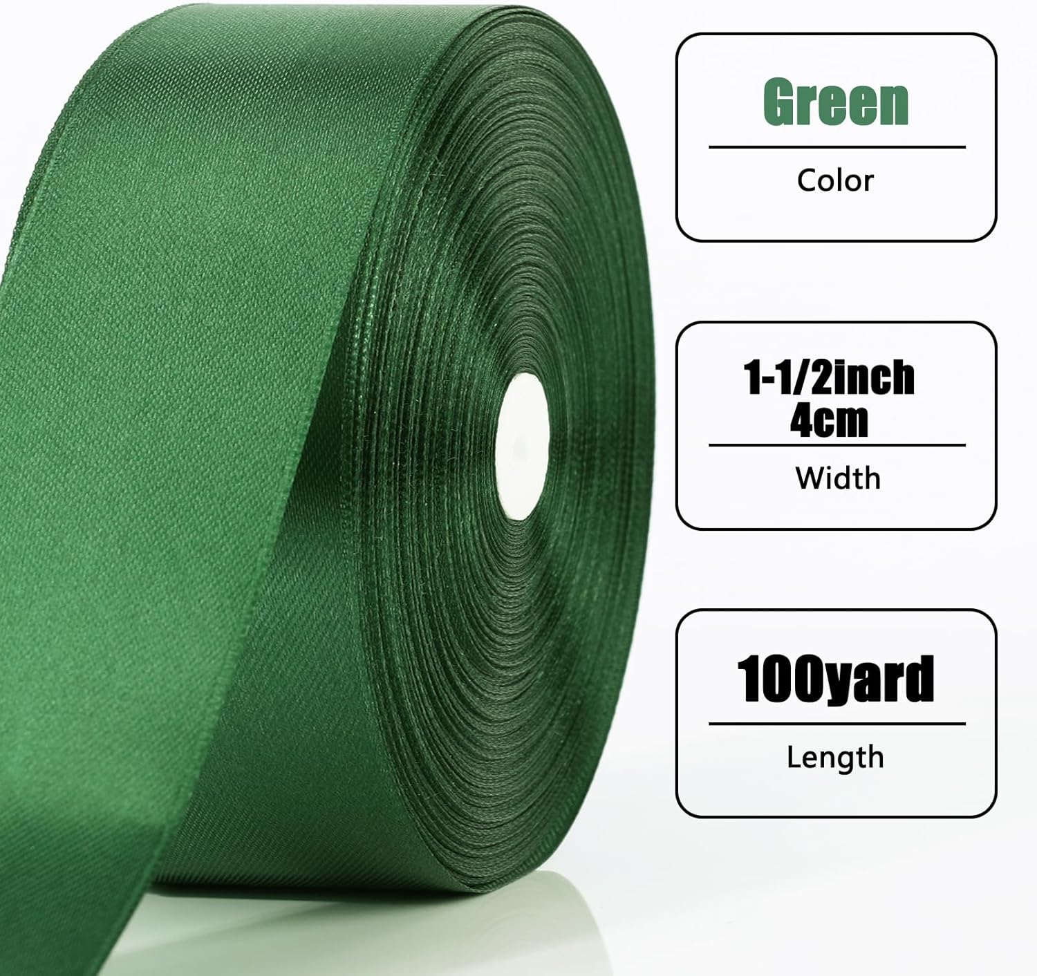 NESCCI 100 Yards Ribbon,1-1/2 Inch Dark Green Satin Ribbon,Single Face Satin Ribbons,Perfect for Gift Wrapping,Wedding Decoration,Handmade Bows,Wrapping Bouquet,Halloween, Christmas