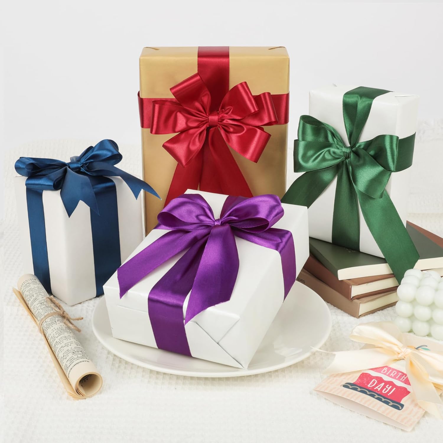 - π Perfect Size: Each roll of ribbon is 1-1/2 inches (4cm) wide, 25 yards (23m) long,Total of 8 rolls,making it easy to cut, fold, twist, or tie into any shape and design you want. It can also be ironed or steamed to remove wrinkles or creases,so that you can reuse it. Enough to meet your different decoration needs.