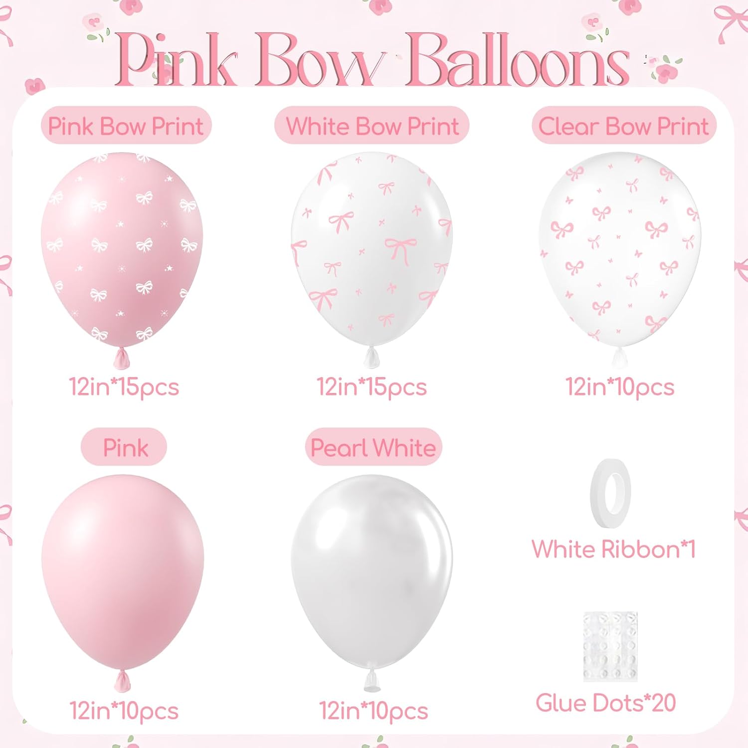 - Package Include: The pink bow balloons include 12inch pink bow balloonsx15, 12inch white bow balloonsx15, 12inch clear bow balloonsx10, 12inch pink balloonsx10, 12inch pearl white balloonsx10, glue dotsx20, white ribbonx1