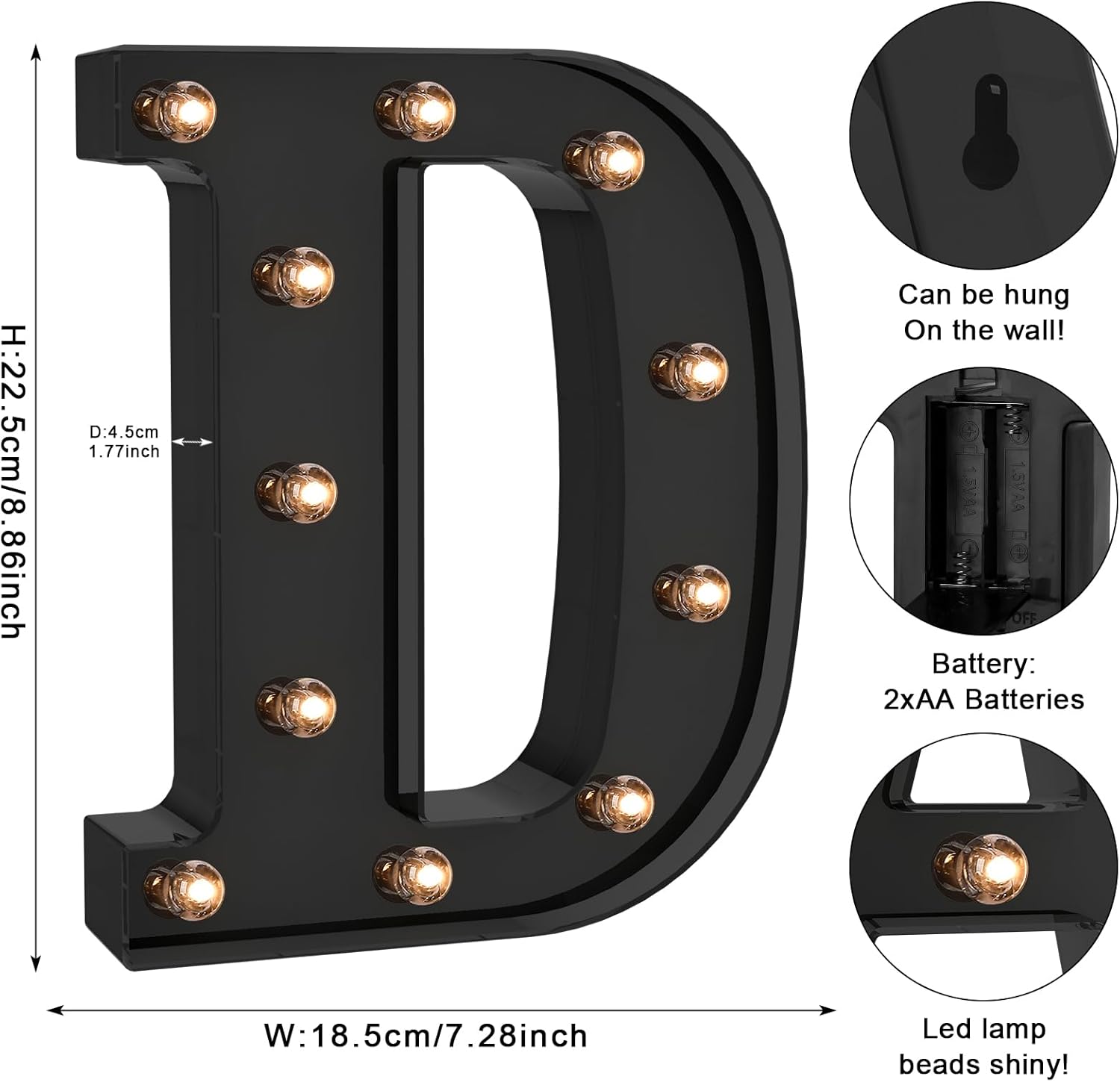 - Our Black light up letters illuminated lights are highly versatile and portable as they measure just 8.66 inches tall, 1.77 inches thick, can be hung on walls and will take 2x AA batteries so they are not too oversized and will not need to be plugged into an electrical outlet.