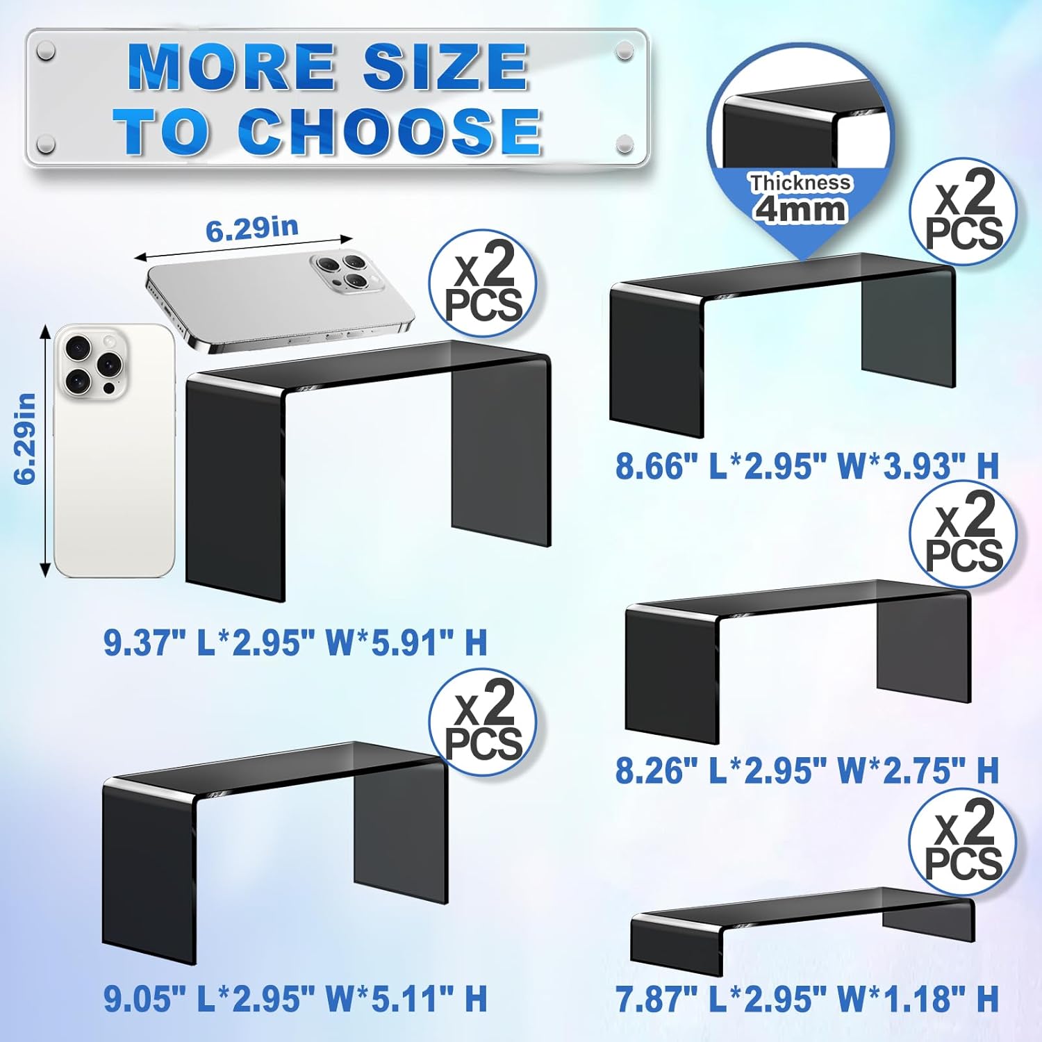 - 5 Sizes to Choose:Package includes 10 pcs black acrylic stands in 5 sizes:7.87"*2.95"*1.18"、8.26"*2.95"*2.75"、8.66"*2.95"*3.93"、9.05"*2.95"*5.11"、9.37"*2.95"*5.91". The different sizes and heights of the display risers are perfect for organizing and displaying artifacts, toys and models, and this stand is not a pure black frosted texture, but a highly transparent matte texture, which looks very high-class and saves visual space