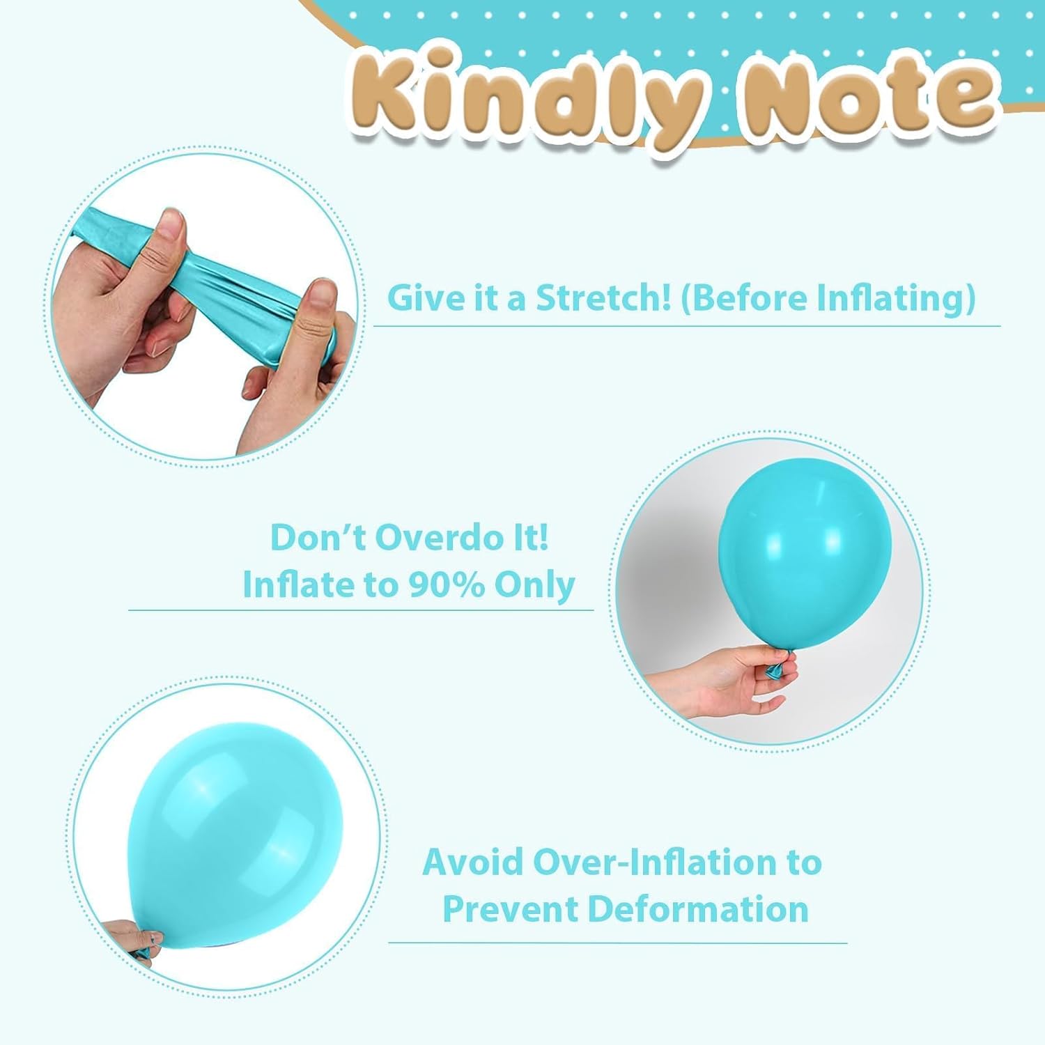 - Party-Ready Tips: Please be careful not to overfill the balloon to avoid bursting,away from sharp objects and direct sunlight to prevent damage. Please note that it is normal for 2-3 balloons out of the all to have some damage or small holes. If you have any questions or need assistance, please don't hesitate let us know.We will help you within 24 hours.