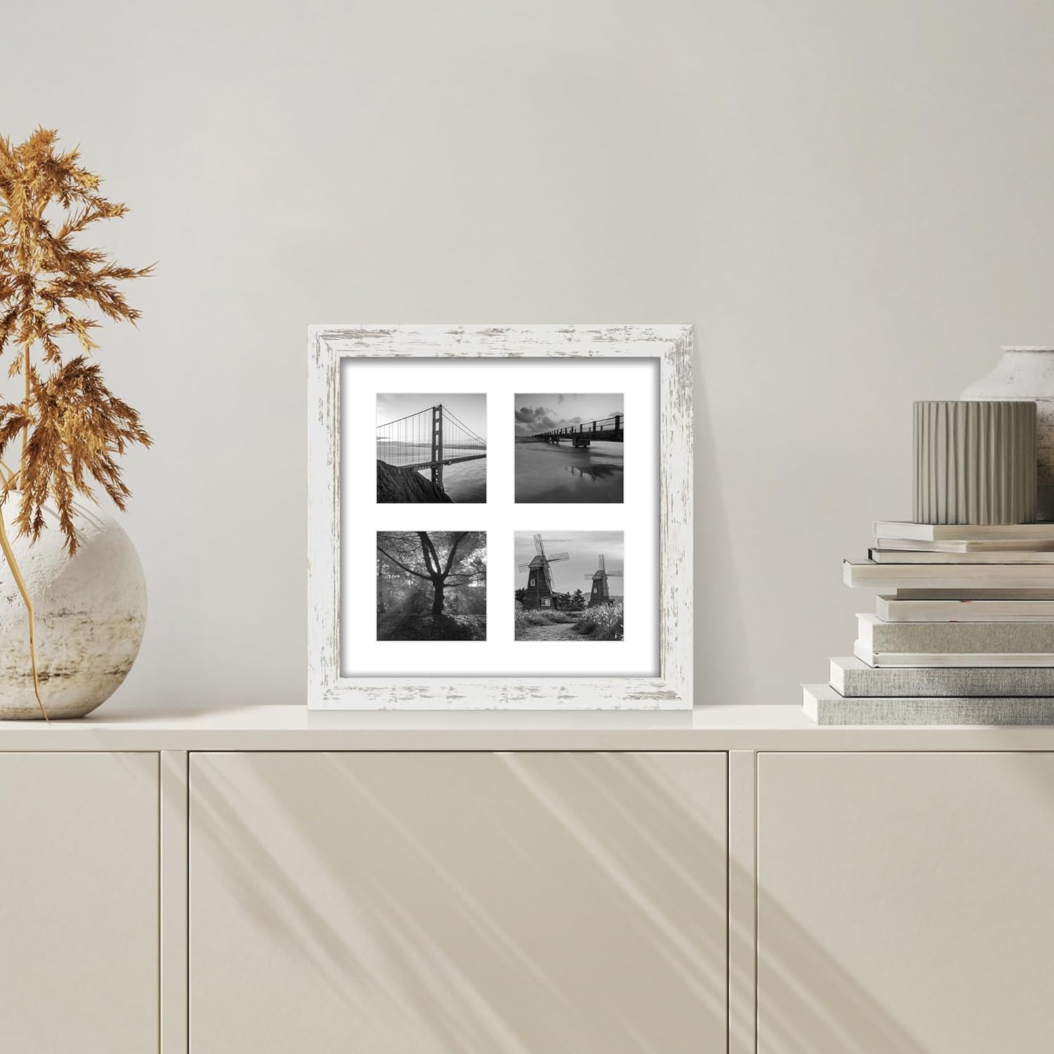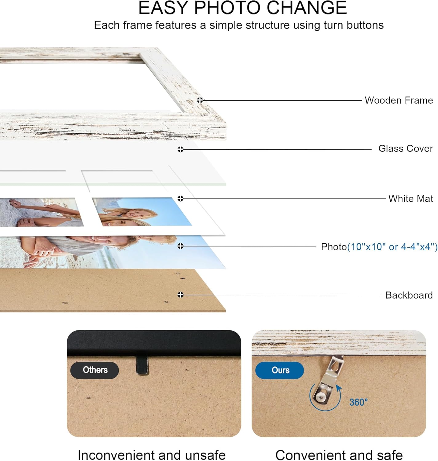 10x10 Picture Frame Set of 2, Real Glass and Distressed White Collage Frame, Display Pictures Four Opening 4x4 With Mat or 10 x 10 Without Mat for Wall Hanging or Tabletop