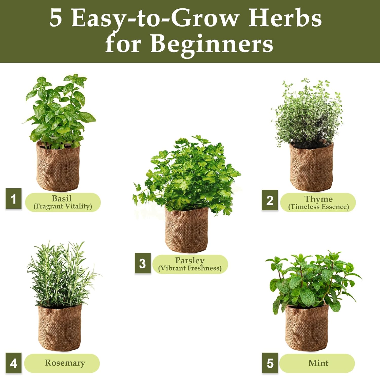 - All-in-One Package: Our kit includes 5 of the widely loved organic, non-GMO herb seeds—basil, parsley, rosemary, thyme, and mint. The set also comes with 5 burlap bags, 5 coconut soil discs, 5 plant markers, 3 gardening tools, 1 pruning scissors, 1 spray bottle, and an wooden box