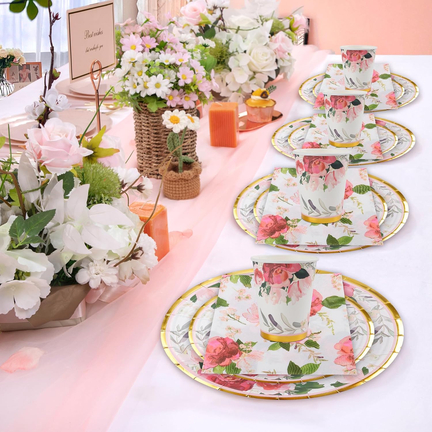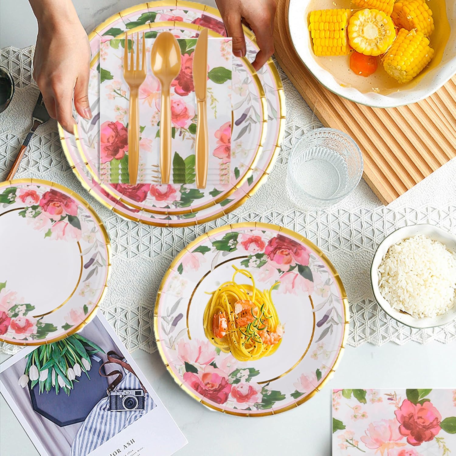 - Disposable Floral Plates Tableware: Includes 35 9-Inch Dinner Plates, 35 7-Inch Dessert Plates, 35 Cups, 35 Napkins And 35 Pink Striped Straws, 35 Knives, Forks And Spoons Each Paper Plates With Elegant Floral Patterns And Gold Trims