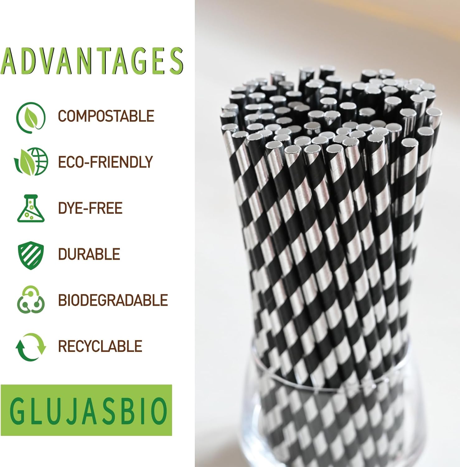 Disposable Paper Straws - Black Silver Striped Drinking Straws for Bar, Wedding, Brithday, Party Supply, Cake Pop Sticks, Cocktail, Drinks, 7.75" x 0.24"