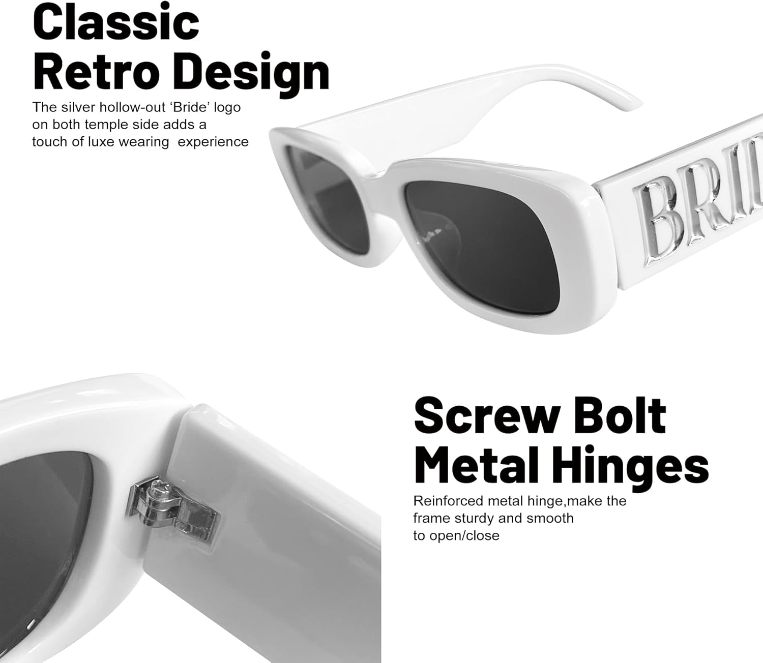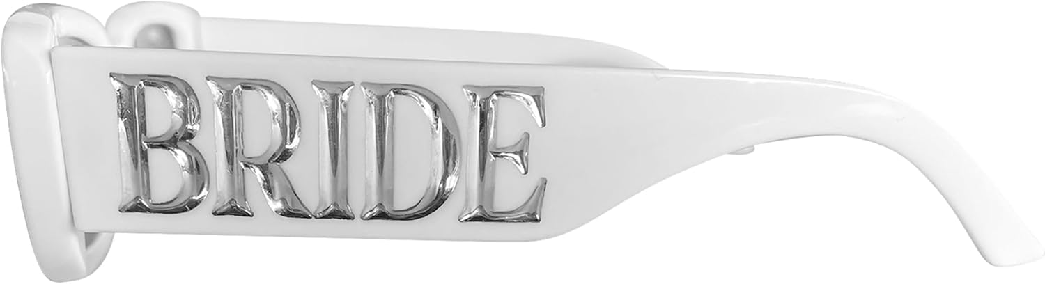 - Classic and Elegant Design:Crafted exclusively for brides,the bride sunglass features a white marble-patterned frame and silver hollow "BRIDE" lettering on both temple sides.Perfect for complementing veils,wedding gowns,or post-ceremony party outfits,these shades add a touch of luxe to your bridal ensemble.