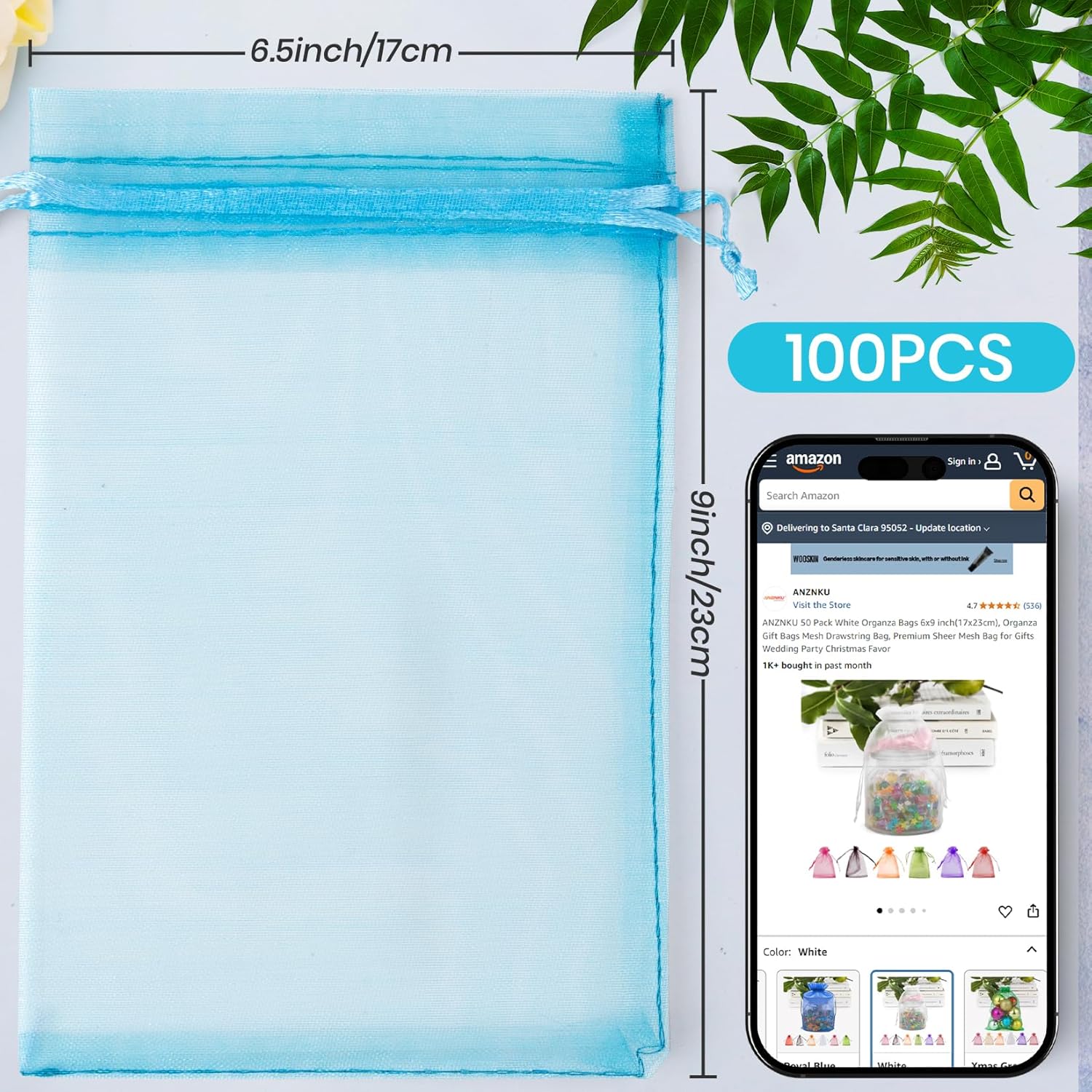 ANZNKU 100 Pack Organza Bags 6x9 Inch, Mesh Bag Drawstring Jewelry Pouches, Large Organza Gift Bags for Party Favor, Baby Shower(Lake Blue)