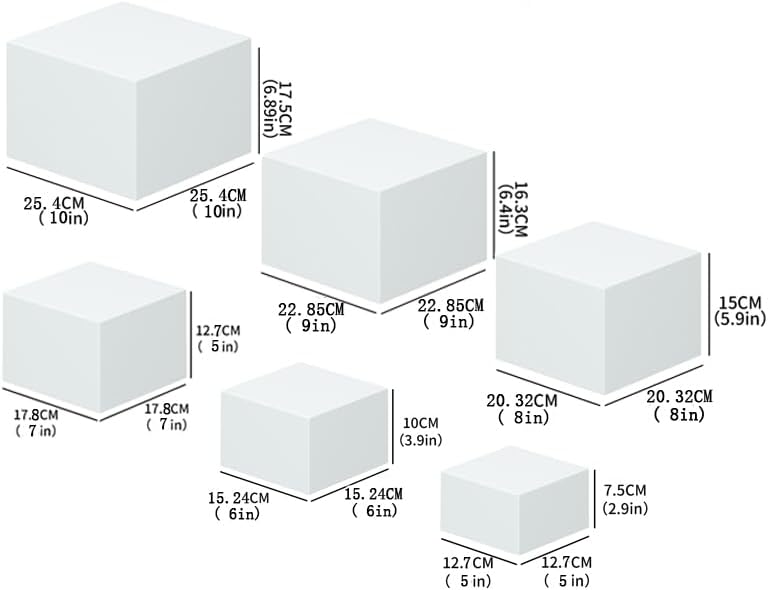 - Multiple specifications:6 different sizes of display risers are available for your use, including large sizes of 10" x 10" x 6" and 9" x 9" x 5", as well as 8" x 8" x 4", and medium sizes of 7" x 7" x 3", 6" x 6" x 2", and 5" x 5" x 1". These are sufficient to meet your display needs for family gatherings or large events