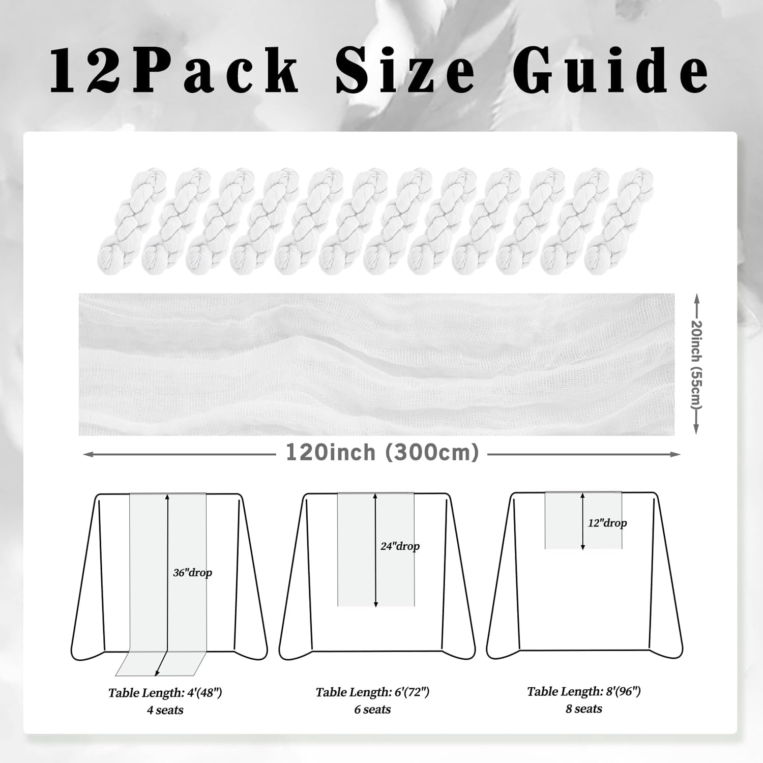 - Cheesecloth Table Runner Size: You will receive 12 white cheesecloth tablerunner, each measuring 20 x 120 inches. The quantity is sufficient for you to decorate various romantic occasions. It can decorate most shaped tables, such as rectangular tables, round tables, and cocktail tables. It is long enough to decorate a large table and be placed perfectly and elegantly on the tabletop, adding a romantic atmosphere to your occasion.