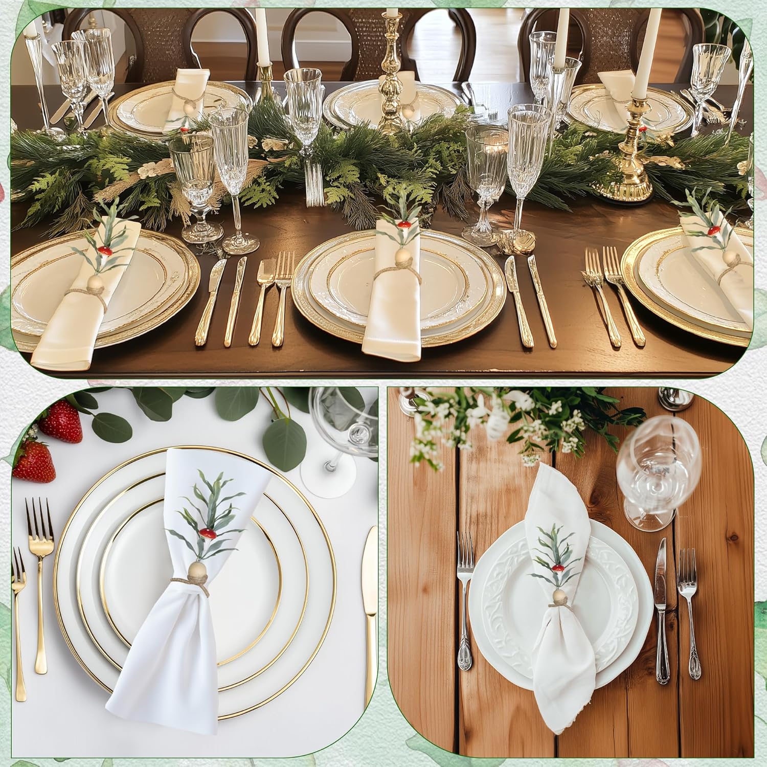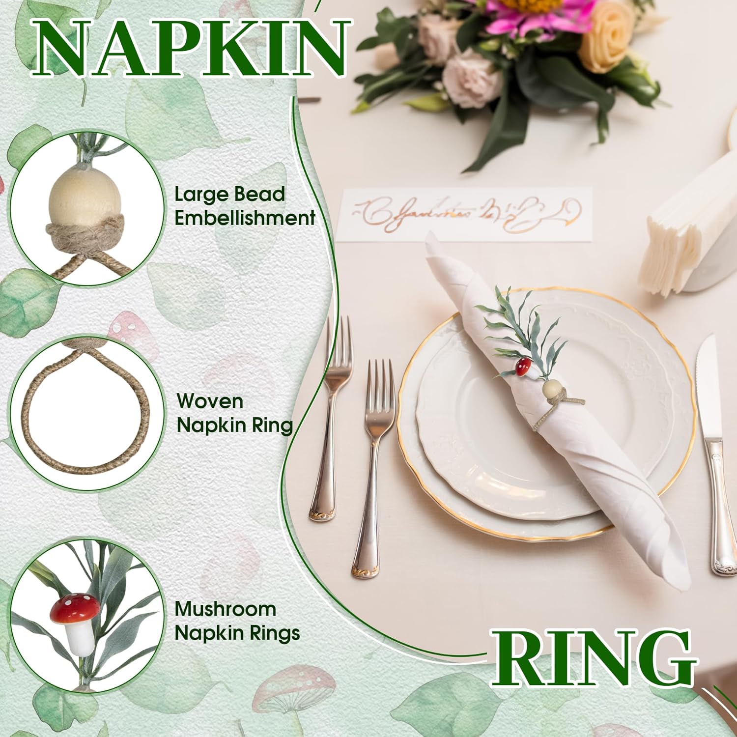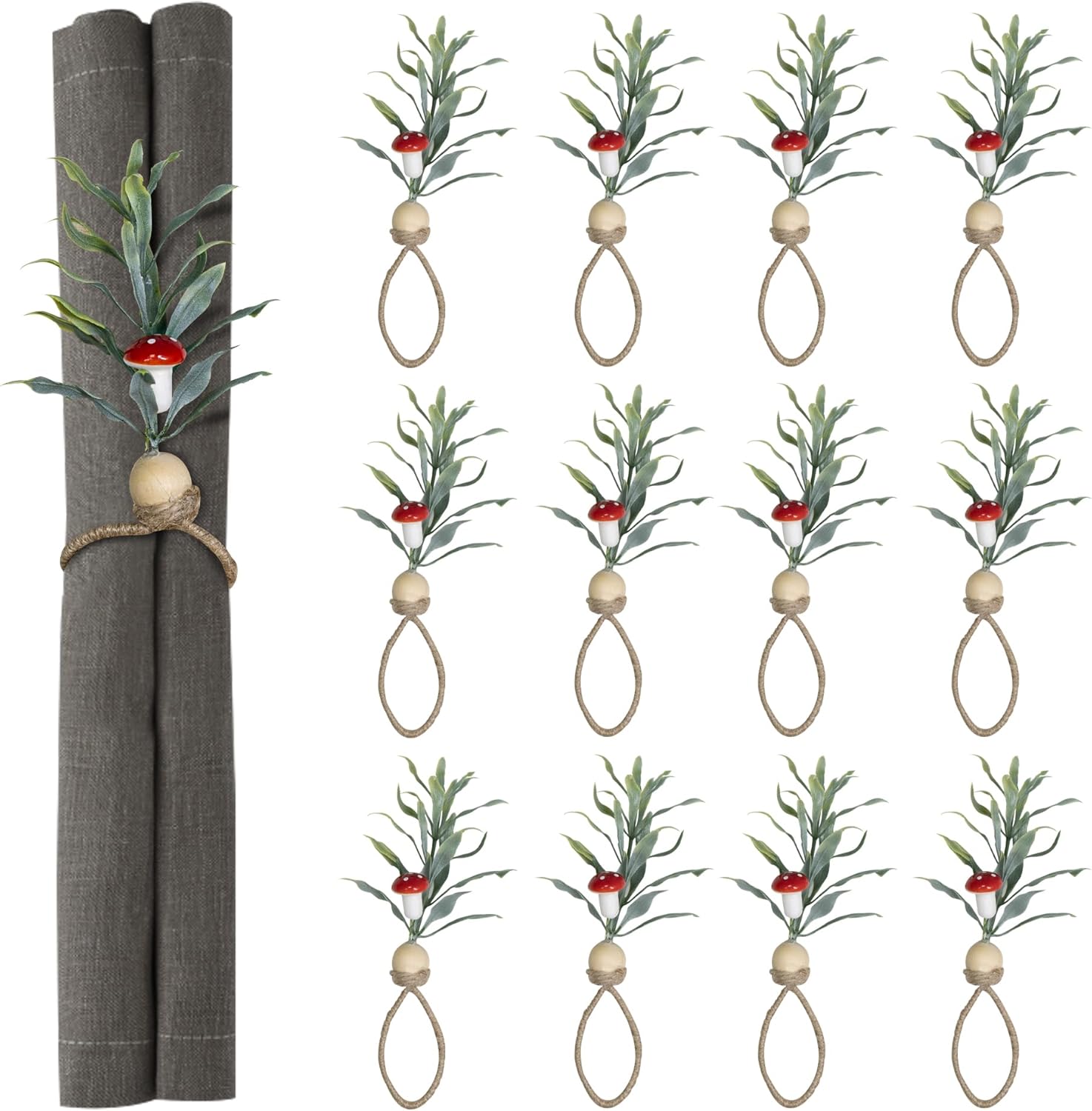 - NAPKIN RINGS SET OF 12: Each green napkin rings is faux with artificial flowers, imitation mushrooms, wooden beads, and linen fabric, which is both sturdy and durable, as well as lightweight and natural.Eucalyptus napkin holder the multifunctional design can perfectly adapt to various styles of napkins, whether it is for daily family dining or formal banquet occasions, it will definitely add unique charm to your dining table.