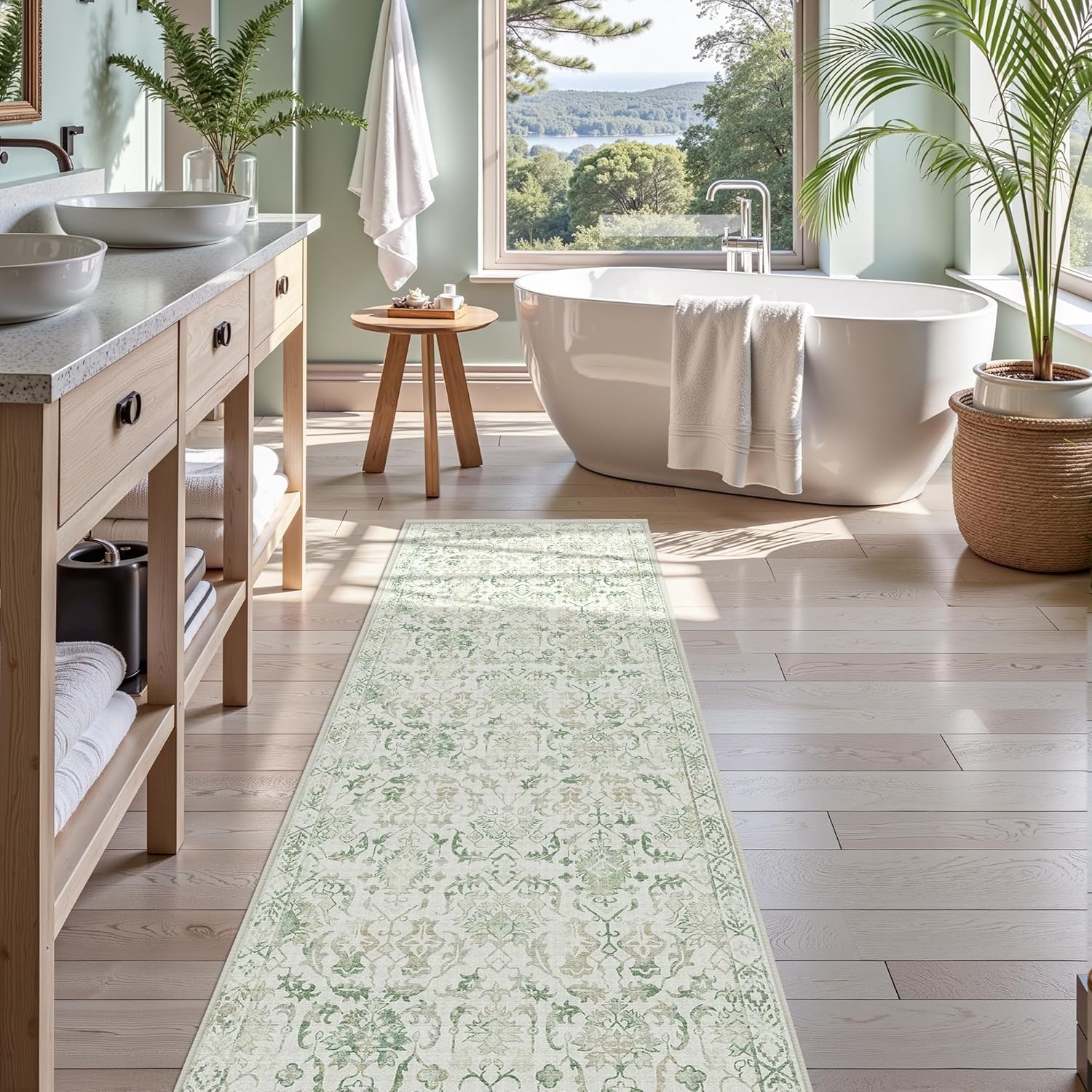 Green 3x10 Runner Rug for Hallways Bed Side Kitchen, Boho Washable Distressed Low-Pile Floor Entryway Long Bathroom Mat, Non-Slip Laundry Room Washstand Front Carpet Green 36x84 Inch