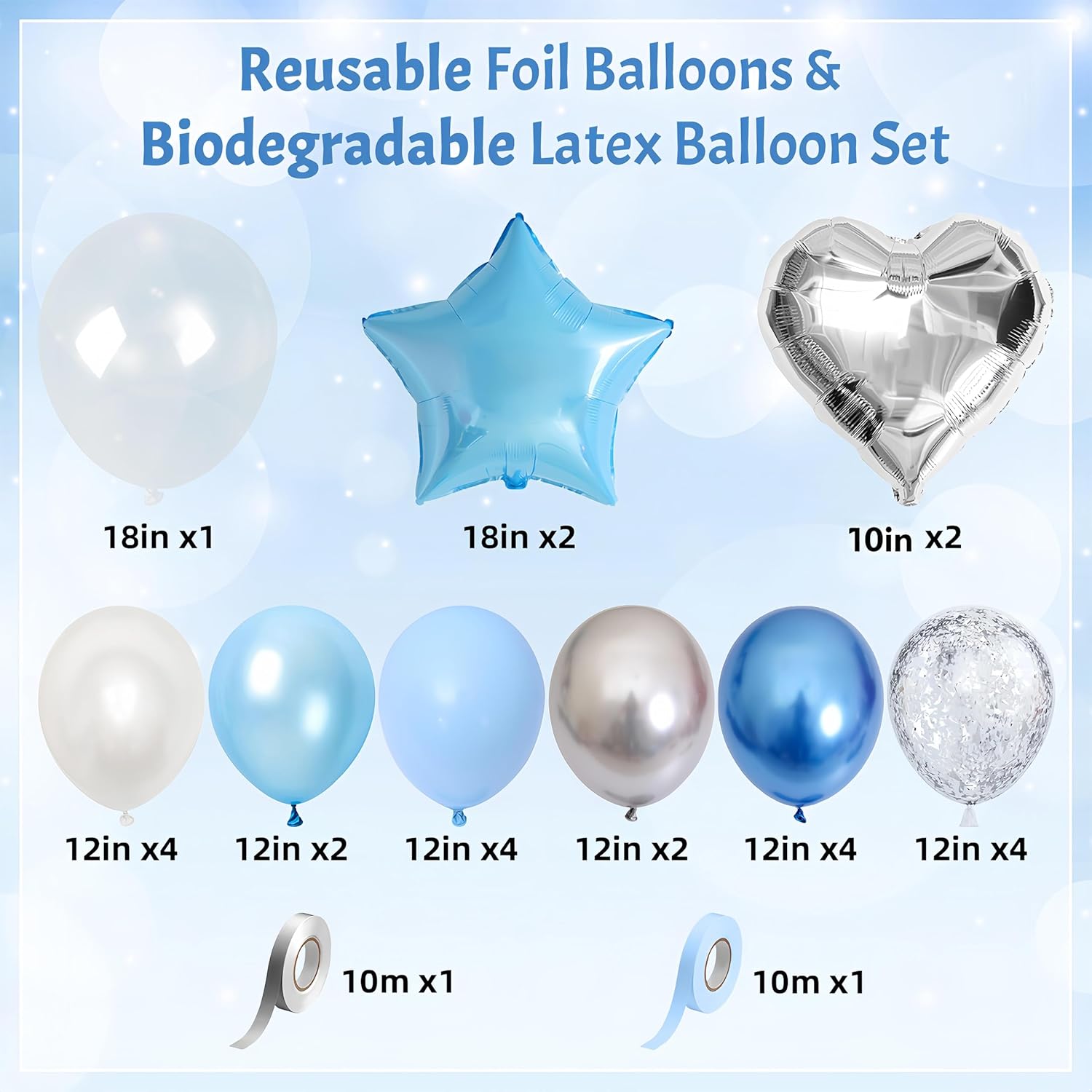 - 🥳【Heart Star Balloons Set - Exquisite&Unique Party Decor】:Light Blue Star Foil Balloons (18-inch x 2), Silver Heart Foil Balloons (10-inch x 2), Transparent Clear Balloon (18-inch x 1), Silver Confetti Balloons (12-inch x 4), Metallic Silver Balloons (12-inch x 2), Metallic Blue Balloons (12-inch x 4), Pearl White Balloons (12-inch x 4), Pearl Light Blue Balloons (12-inch x 2), Macaron Blue Balloons (12-inch x 4), Ribbons (Light Blue x 10 M, Silver x 10 M).