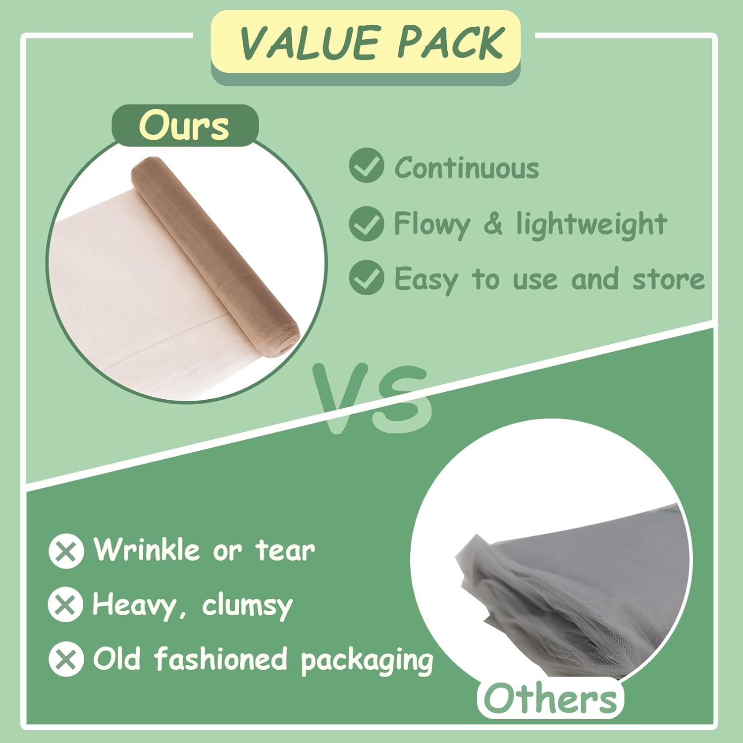 - CONTINUOUS 54 INCH X 10 YARDS(30 FT): Large area tulle fabric. It is flowy and more durable than others, without wrinkle or tear.