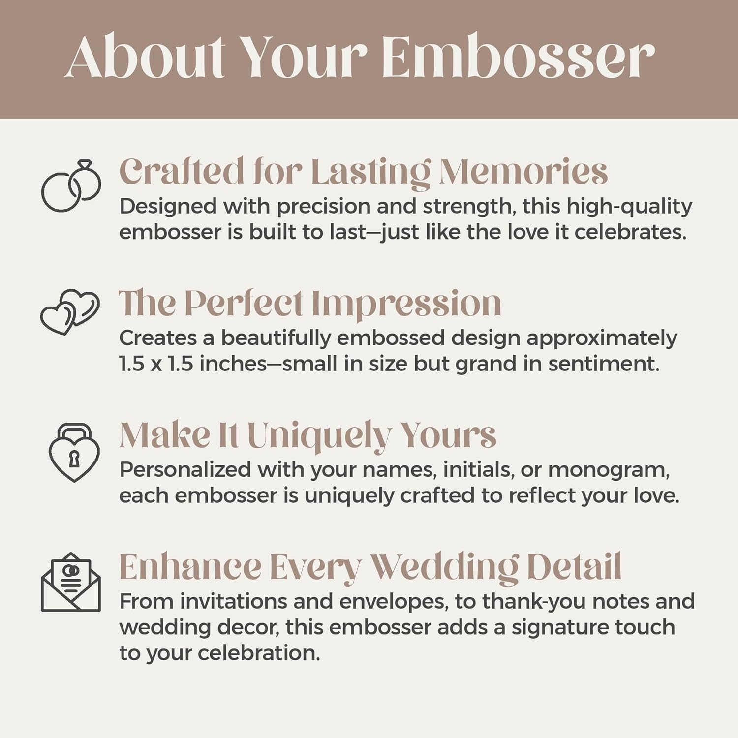 - VERSATILE USE – Ideal for embossing wedding invitations, RSVP cards, menus, cocktail napkins, and keepsakes. Impression size is 1.5" round and embosses from the bottom of the page.