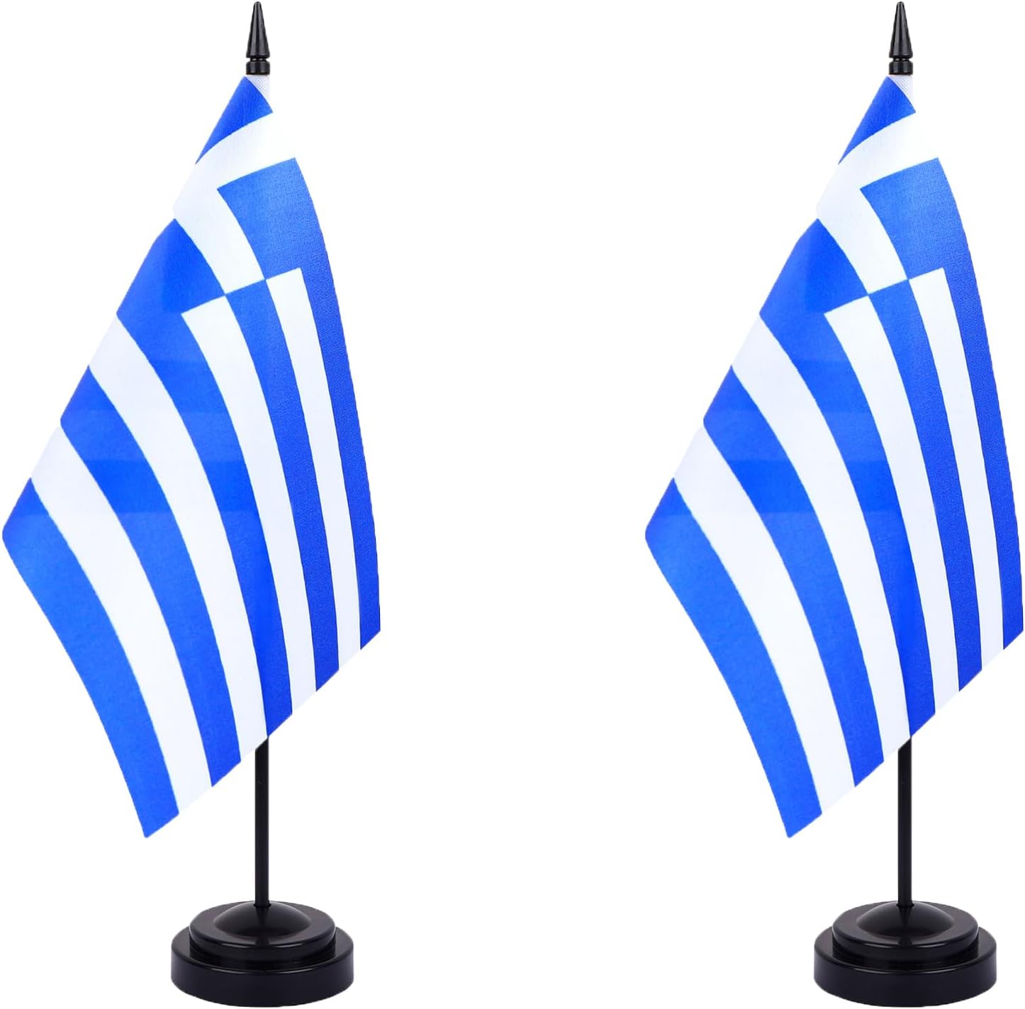 Greece Desk Flag 12" Solid Pole Deluxe Set Greek Flags Banner Mini Small Greece Office Table Flags with Black Stand Base Desktop Decorations(2Pack)