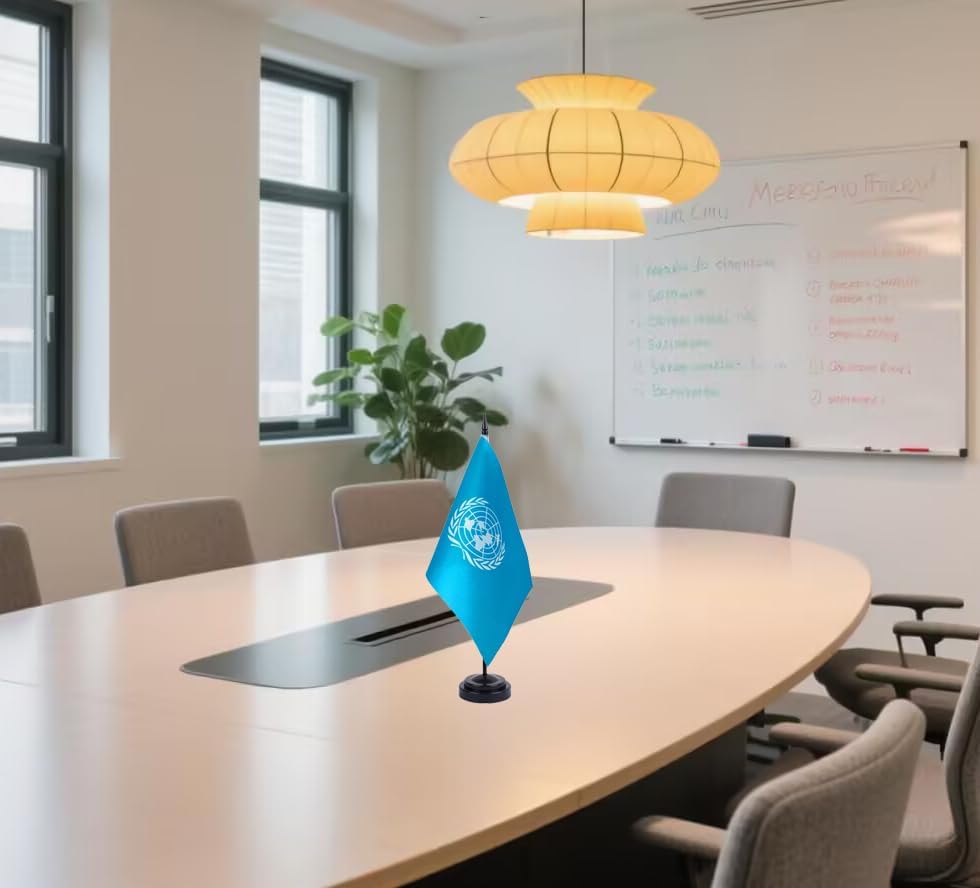 United Nations Desk Flag 12" Solid Pole Deluxe Set United Nations Flags Banner Mini Small United Nations Office Table Flags with Black Stand Base Desktop Decorations(2Pack)
