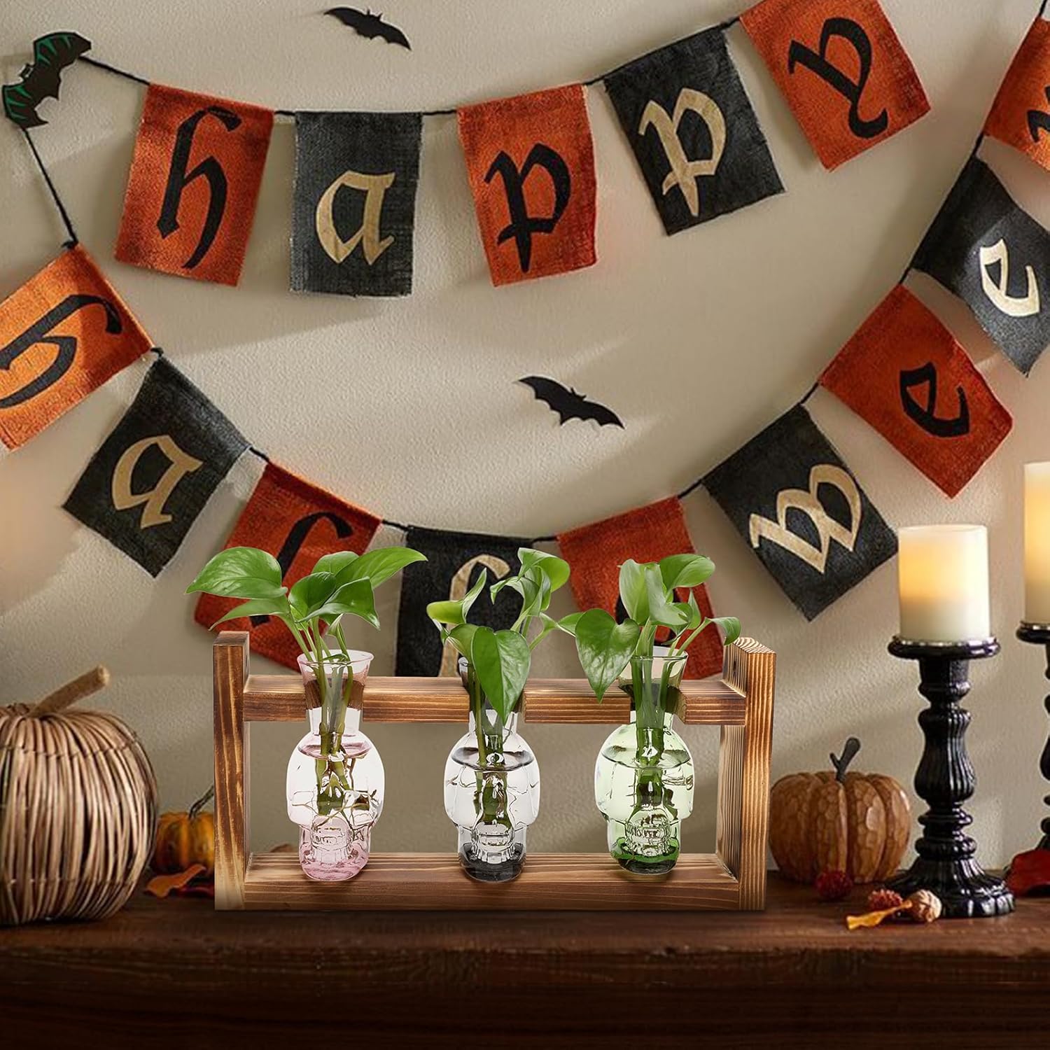 Plant Terrarium Propagation Stations Hydroponics Halloween Skull Planter Vase Skulls Decor with Wooden Stand Gife for Father
