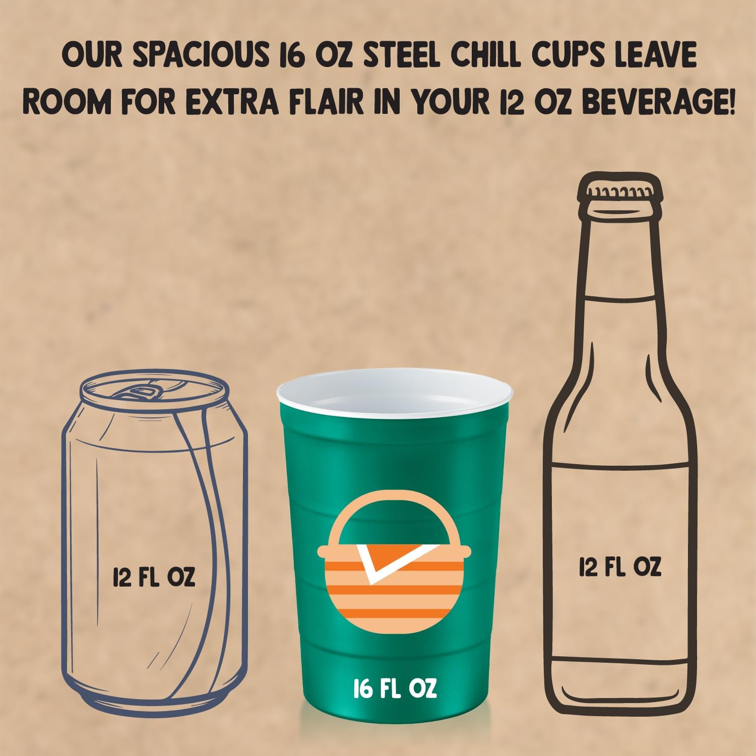 - Earth-Friendly Drinkware: Unlike plastic party cups that end up in landfills, sustainable celebratory Steel Chill Cups are 100% recyclable; reuse hand-washable cups for your party event