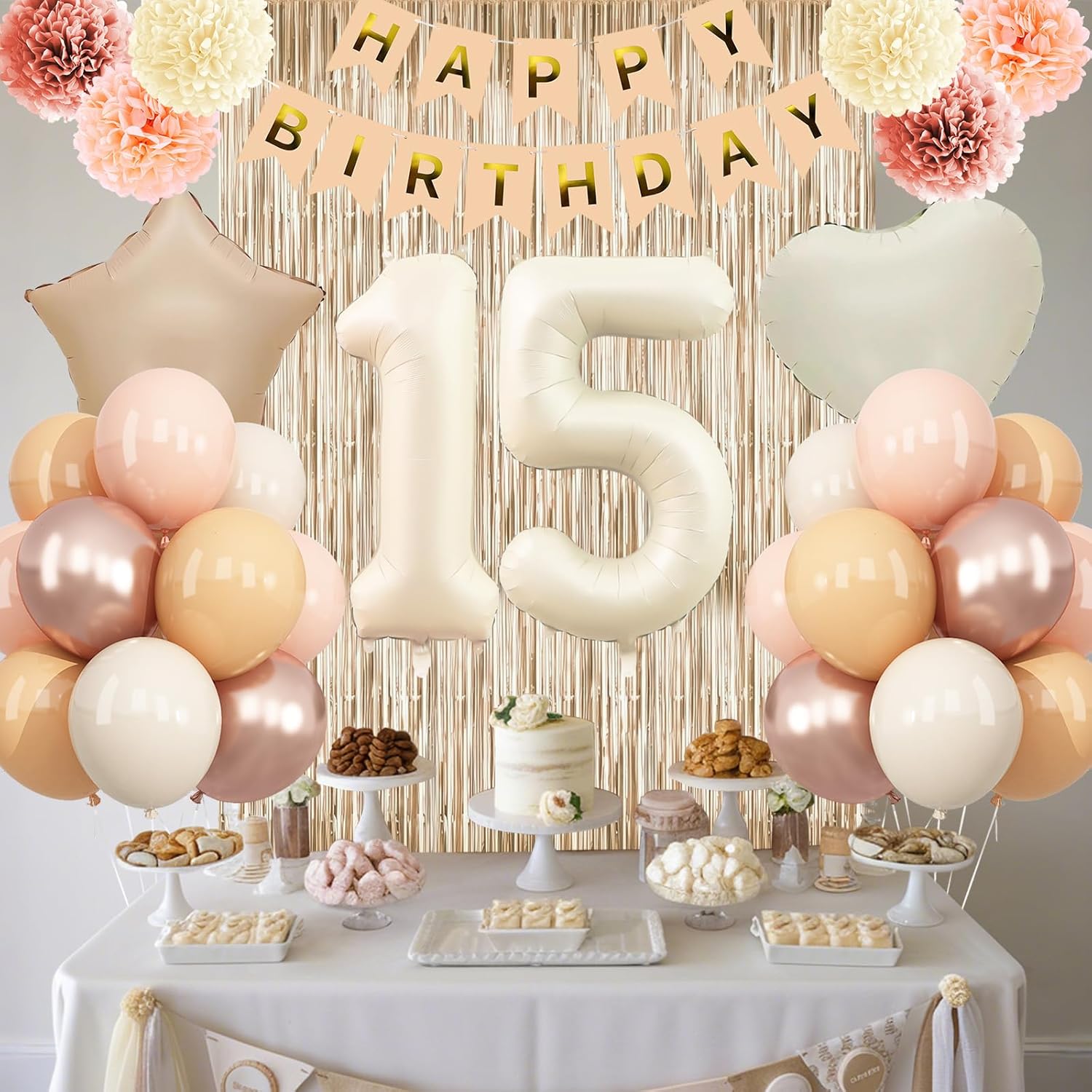 - PACKAGE INCLUDES: 1pc beige 15 number balloon, 1pc happy birthday banner, 2pcs dusty pink paper pom poms, 2pcs blush paper pom poms, 2pcs nude paper pom poms, 1pc champagne gold fringe curtain, 1pc caramel star foil balloons, 1pc cream heart foil balloons, 8pcs nude balloons, 6pcs blush balloons, 8pcs beige balloons, 4pcs champagne gold balloons, 1pc ribbon