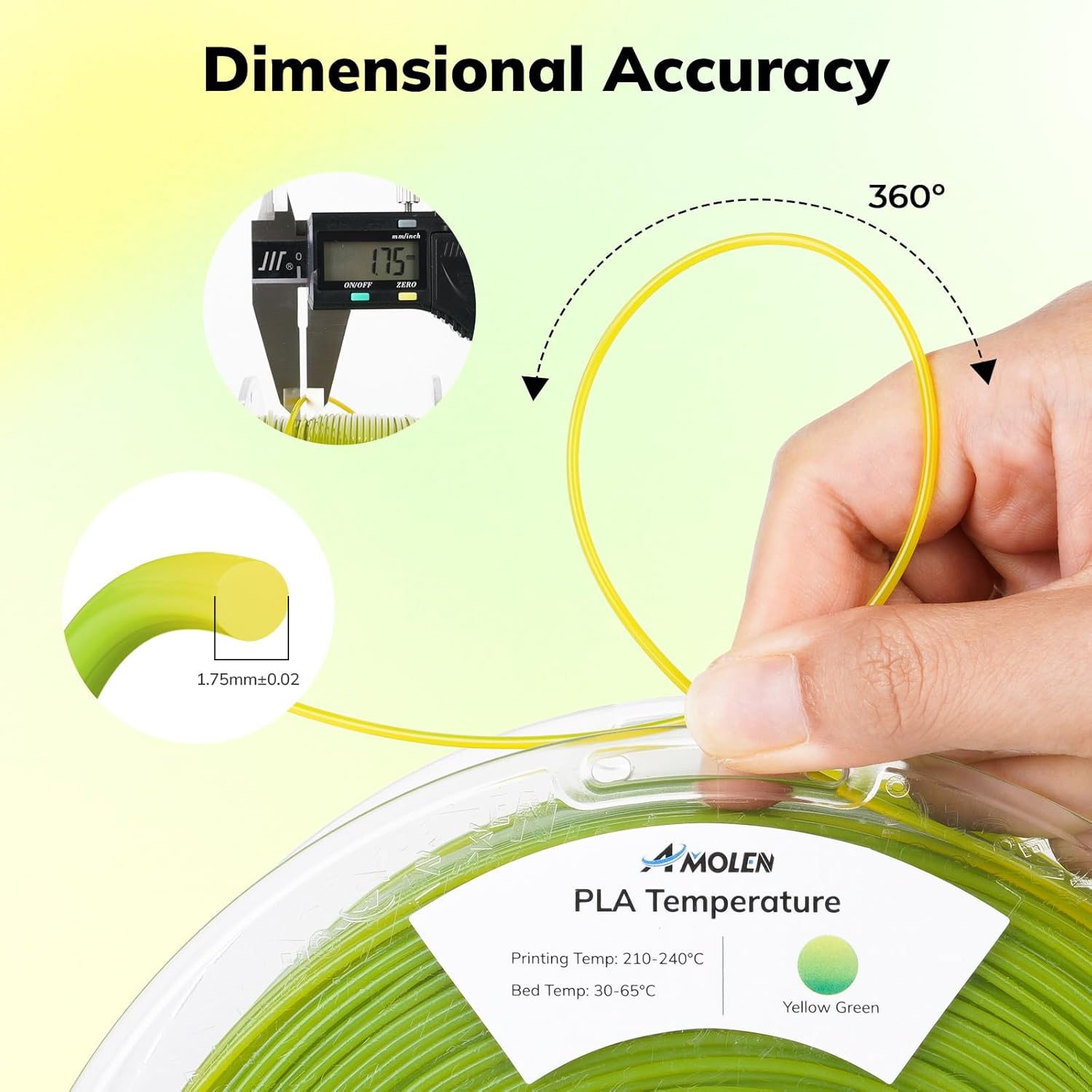 AMOLEN 3D Printer Filament, Temp Change Green to Yellow PLA Filament 1.75mm, Cold & Heat Temp Color Change with Temperature Filament, Dimensional Accuracy +/- 0.02mm, 1KG/2.2lb, Fits Most FDM Printers