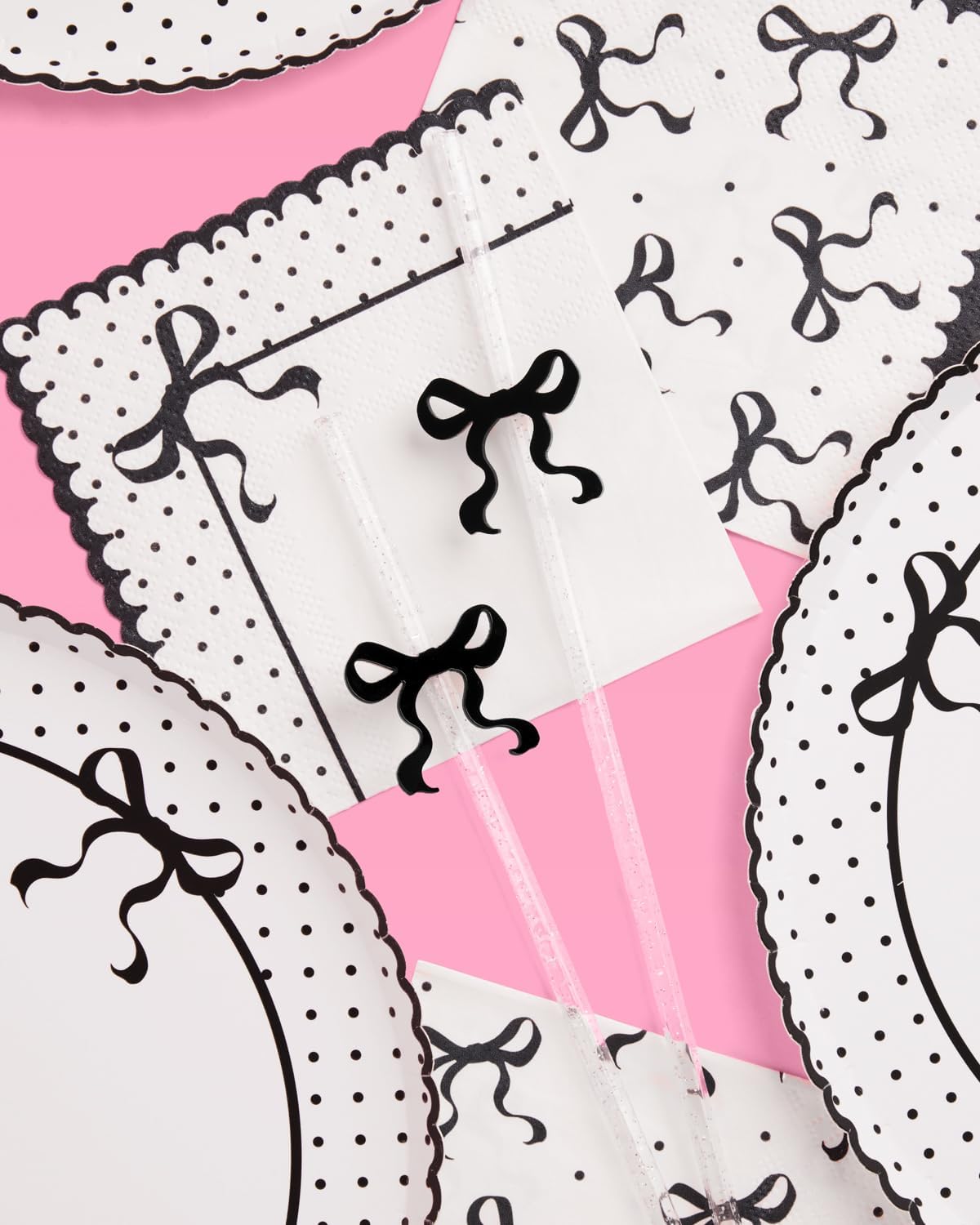 xo, Fetti Black Bow Reusable Straws, 12pcs - Clear Glitter Plastic | Birthday Drink Decorations, Coquette Drinkware, Tying the Knot Party Favor, Bachelorette Decor