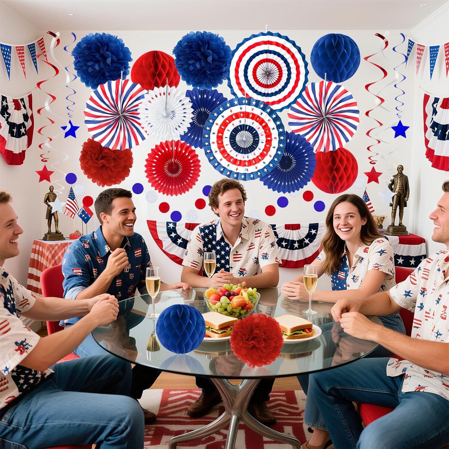 - [Package contains]: Red white and blue party decorations with 8PCS patriotic hanging paper fans in diffrent size, 1PCS 8.2ft triangle flag banner, 2PCS red + 2PCS blue + 2PCS white hanging swirls star, 4PCS 8in honeycomb balls, 4PCS 8in paper pom poms flowers, 1PCS 6.5ft circle banner. The color combination is very unique.