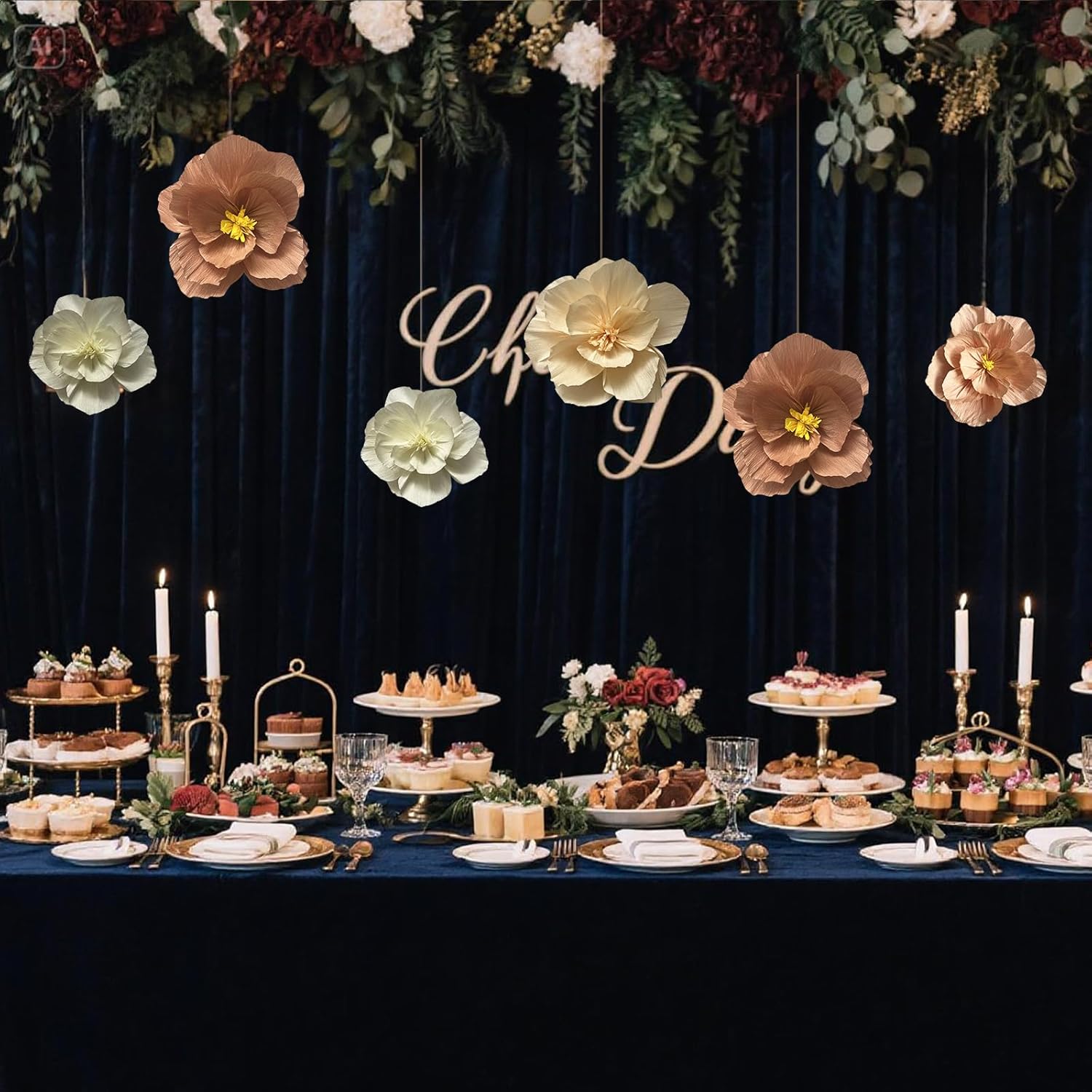 - Crepe Paper Flowers: Total 9pcs paper flowers in 3 sizes 12”, 10”, 8” and 4 colors pink beige peach.