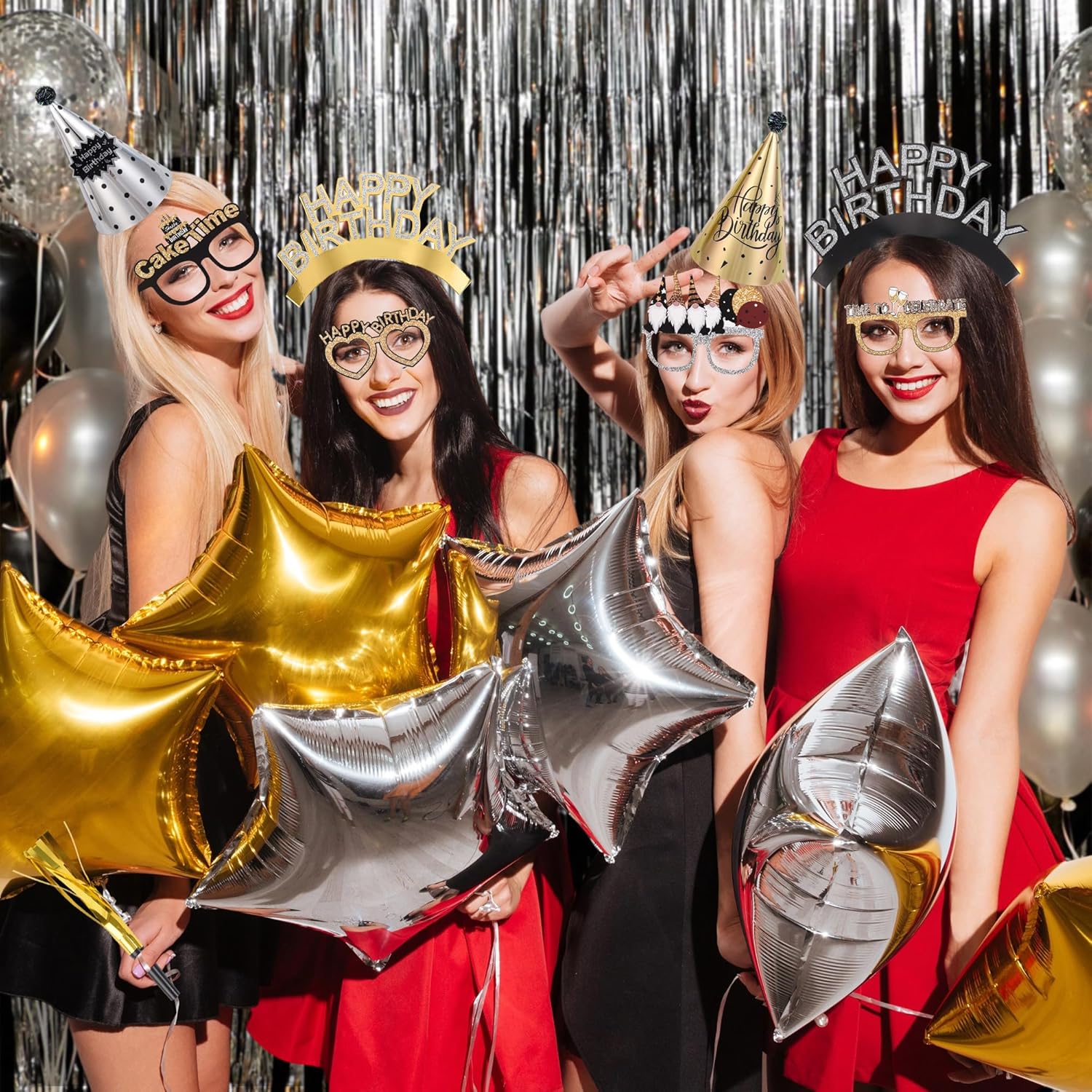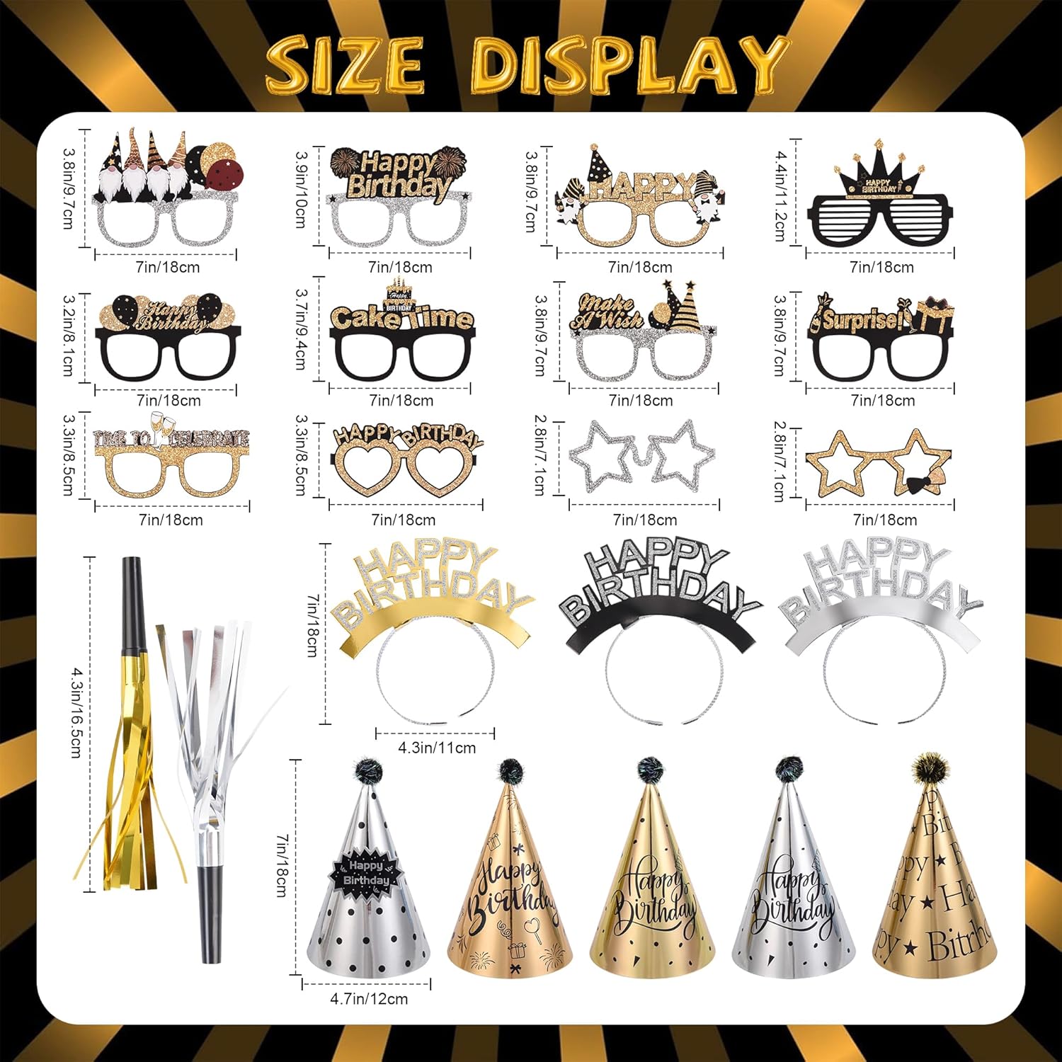 - Black Golden Design: these birthday party decorations kit are mainly in black, silver and gold color, funny headbands with glitter powder, sparkling under light, hat and prop glasses printed with βHappy Birthday β, eye-catching, delicate birthday party accessories for role playing and taking photos. The party blowers whistle makes fun sounds and brings a fun atmosphere to party events