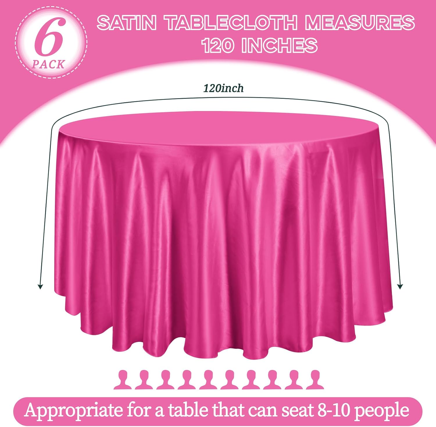 - 【Round Satin Tablecloths】6 Pieces premium hot pink satin round tablecloth. The size of silk satin table cover is 120 inches, large enough to decorate a table that can accommodate 8-10 persons. It is suitable for most household round tables and can meet your different needs. Sufficient quantities are sufficient for party decoration. The tablecloth size is usually larger than your table size. Please measure your table size before buying.