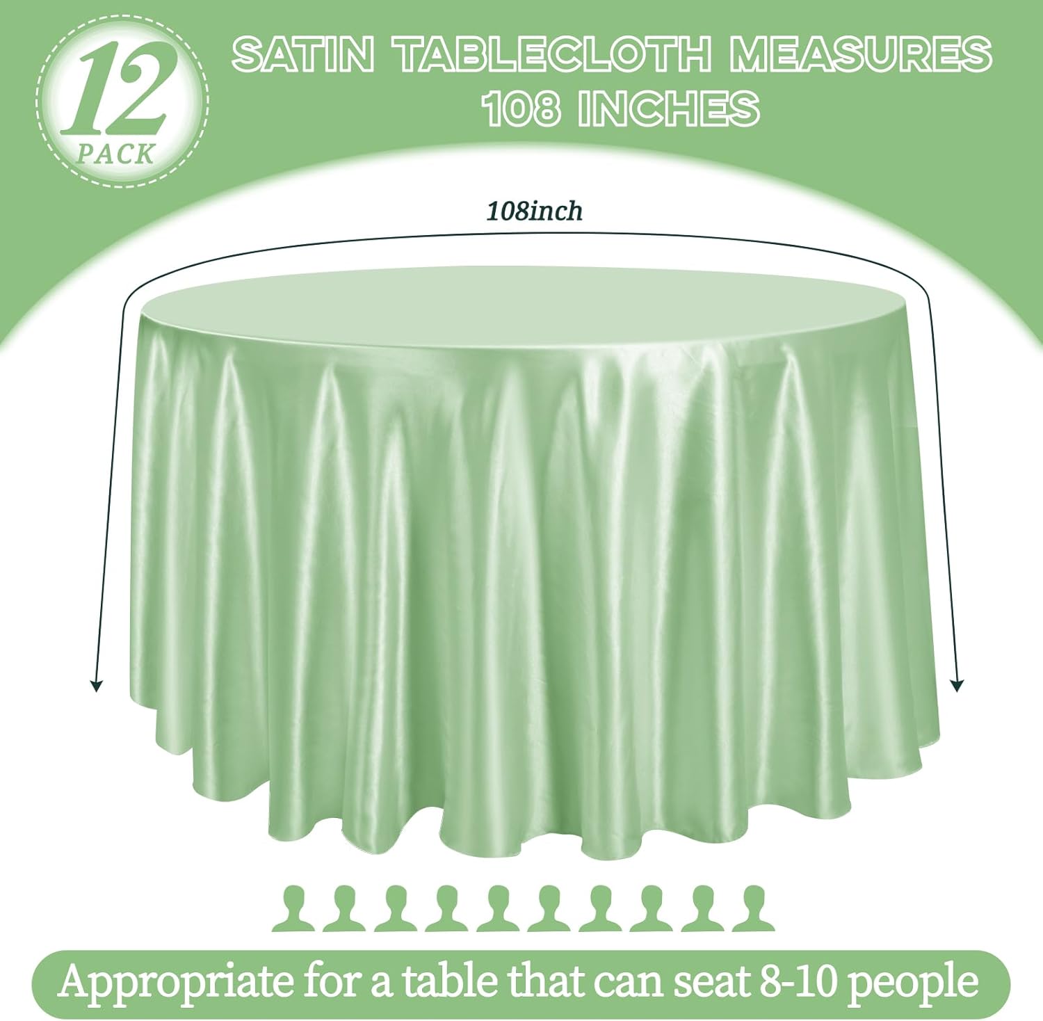 - 【Round Satin Tablecloths】12 Pieces premium sage green satin round tablecloth. The size of silk satin table cover is 108 inches, large enough to decorate a table that can accommodate 8-10 persons. It is suitable for most household round tables and can meet your different needs. Sufficient quantities are sufficient for party decoration. The tablecloth size is usually larger than your table size. Please measure your table size before buying.