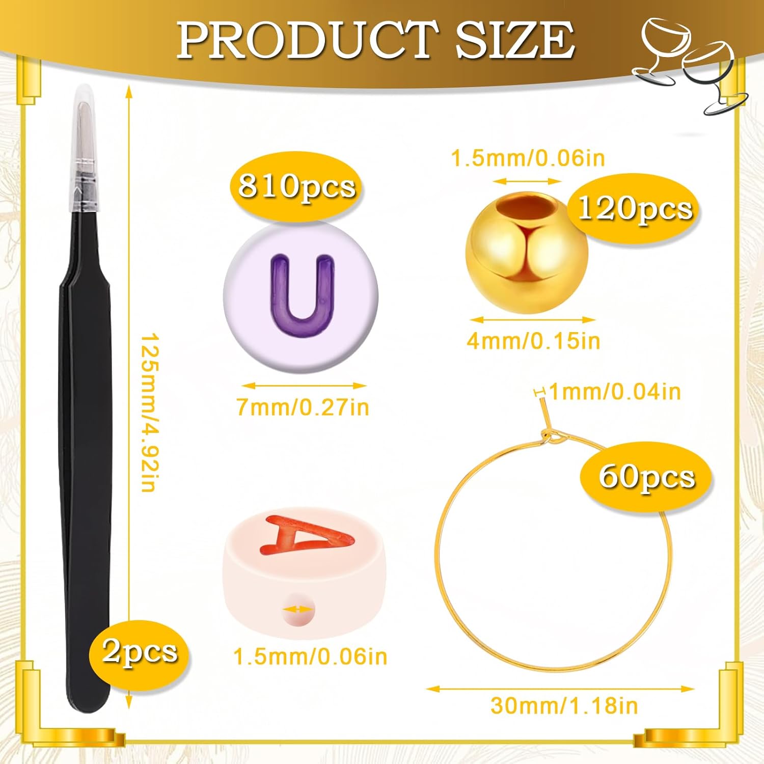 - 🎨 810-Piece DIY Wine Charm Kit – Everything Included. This all-in-one kit features 780 letter beads (30 of each A–Z), 30 heart beads, 120 gold spacers, 60 durable metal rings, and 2 precision tweezers. Spell names, initials, or party phrases without running out of letters—no filler, no frustration.